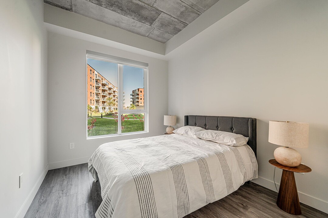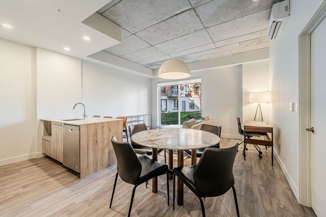 L'unité: - Salle à manger et salon à aire ouverte très lumineux avec plafond en béton - Cuisine avec îlot, espace optimisé et électroménagers en inox - Chambre principale de bonne dimension avec walk-in - 2e chambre avec double penderie - Penderie dans le vestibule - Laveuse et sécheuse dissimulées dans une penderie - Balcon privé - Services inclus: le wifi haute vitesse et tous les coûts d'électricité, de chauffage et de climatisation sont inclus à votre loyer - Toiles de fenêtres - Un espace rangement pour vélos - Stationnement intérieur (avec frais supplémentaire de 175$/mois) et accès aux bornes de recharge