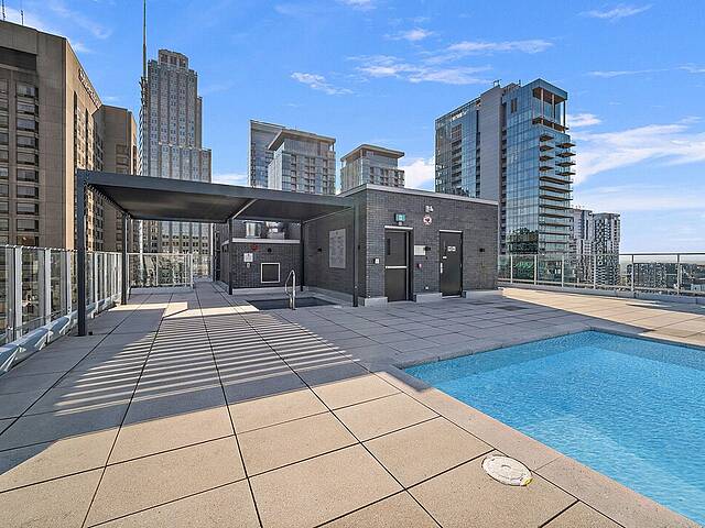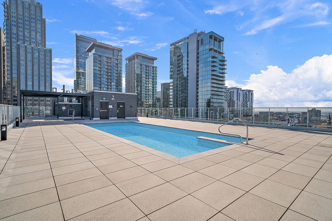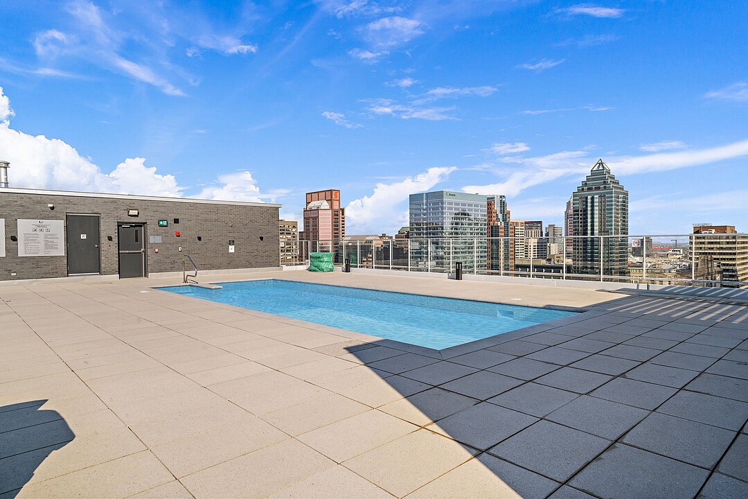 Services et commodités de l'immeuble Le Drummond : - Salle d'entraînement - Piscine extérieure - Terrasse sur le toit - Salle commune - Espace pour vélos au sous-sol - Ascenseurs haute vitesse