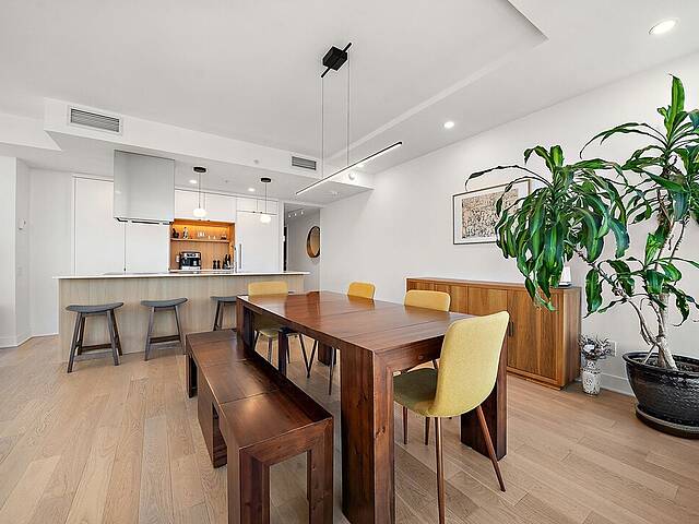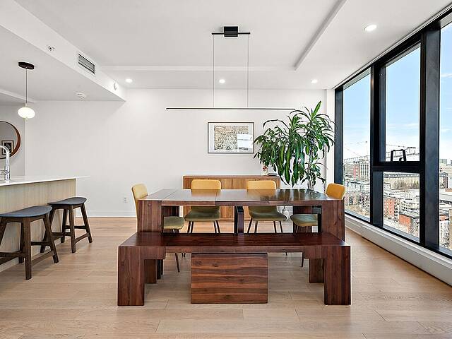 - Aire de vie ouverte et chaleureuse, baignée de lumière grâce à de nombreuses fenêtres offrant une vue panoramique. - Cuisine contemporaine offrant des espaces de rangement fonctionnels. - Électroménagers de la cuisine encastrés dans le mobilier pour un look épuré et moderne. - Chambre principale avec walk-in pour un maximum de rangement. - Deuxième chambre avec double garde-robe - Salle de bain, avec plancher chauffant, bien pensée avec baignoire et douche indépendante. - Penderie de type walk-in dans l'entrée - Colonne de béton apparente et plafonds de 9 pieds ajoutant du caractère à l'espace.