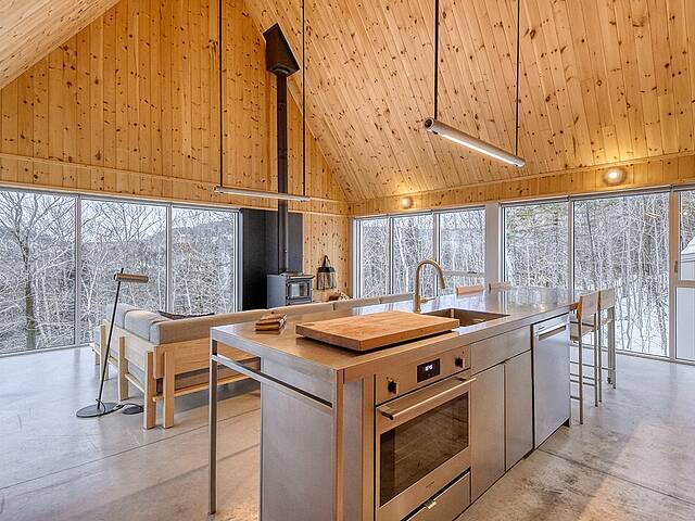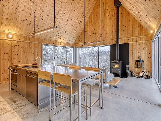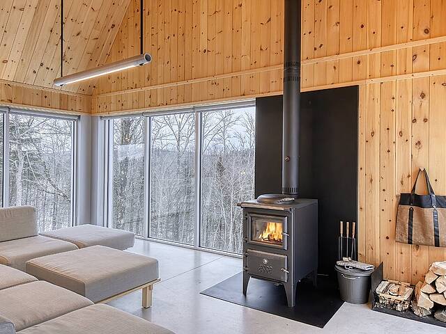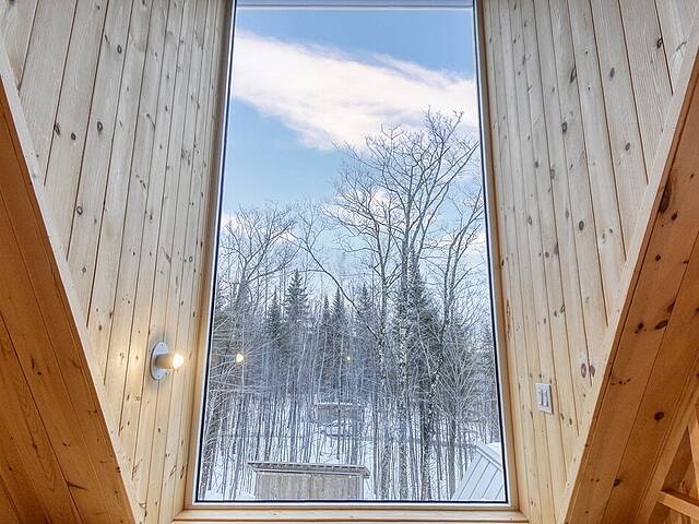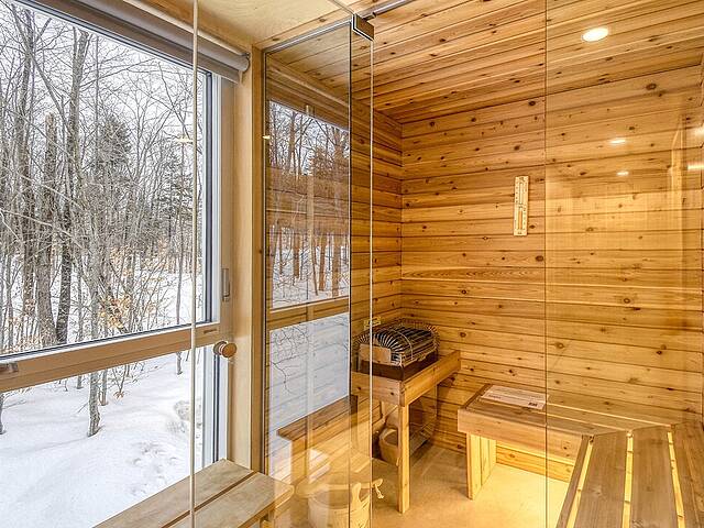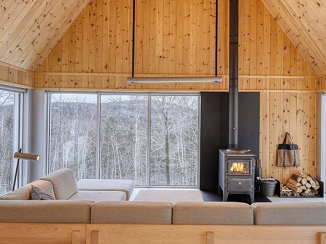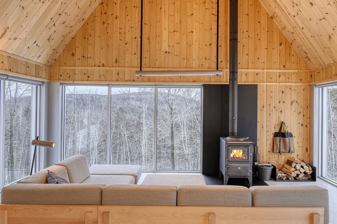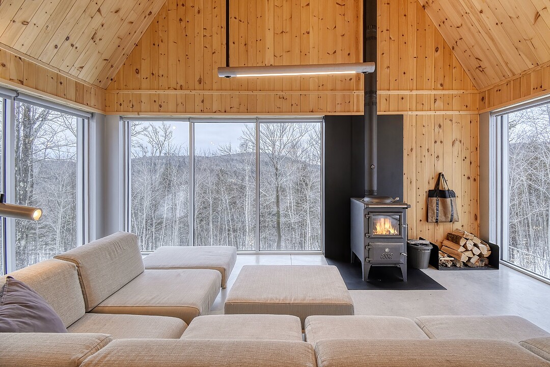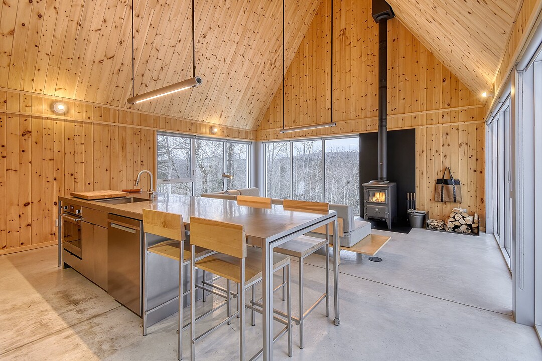 2e étage : - Spacieuse pièce de vie à aire ouverte, baignée de lumière naturelle et offrant une vue panoramique sur les montagnes et la nature environnante, avec très haut un plafond cathédrale. - Cuisine avec comptoir à déjeuner, grand espace de rangement et électroménagers de qualité - Salon avec foyer au bois à combustion lente - Salle d'eau - Salle de sauna vitrée, avec douche - Laveuse-sécheuse dissimulée dans une penderie