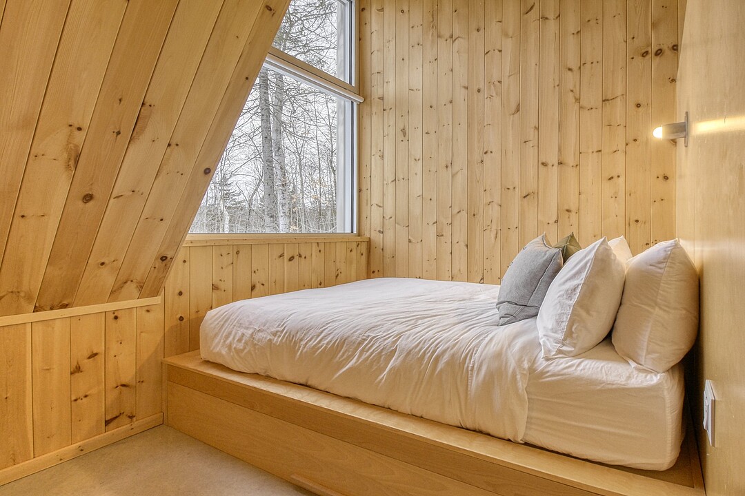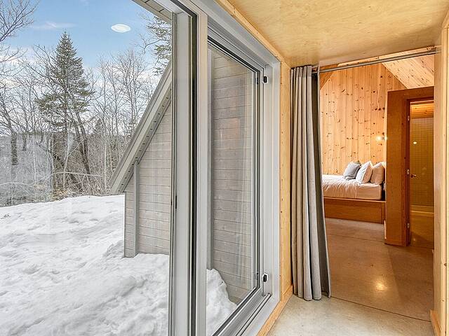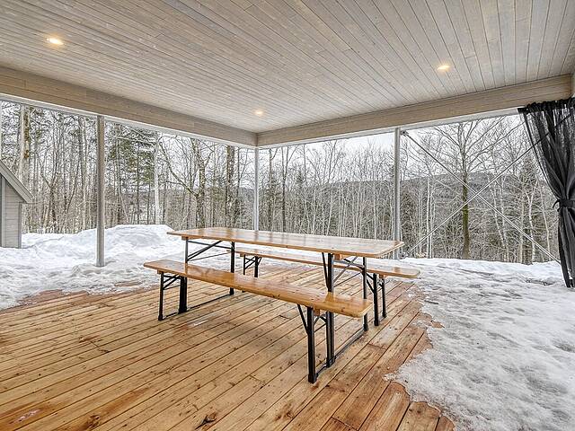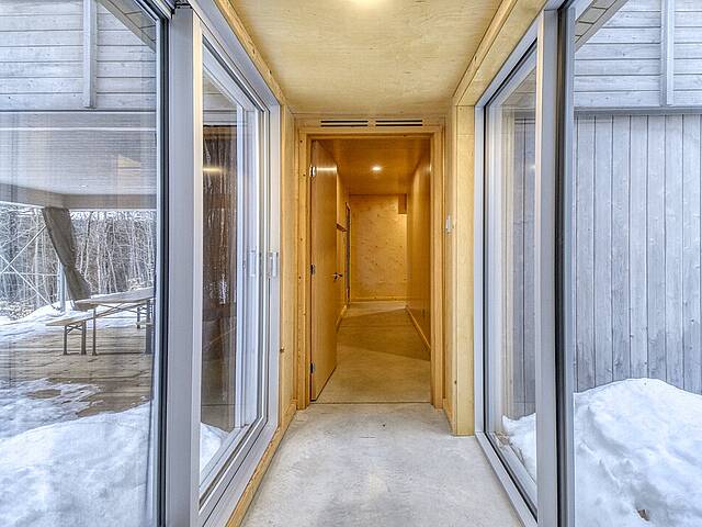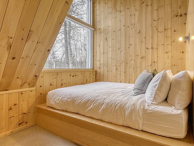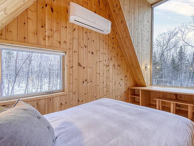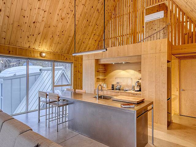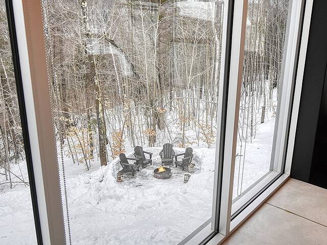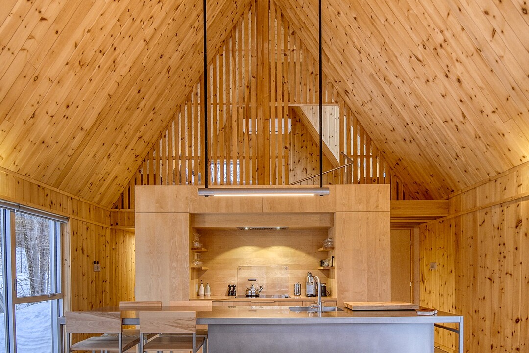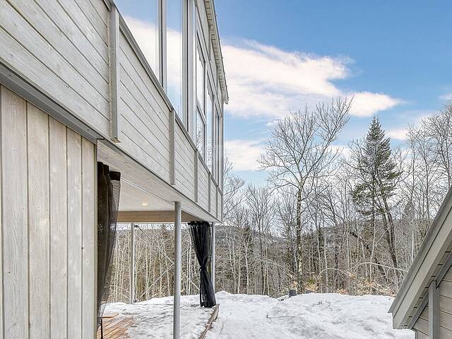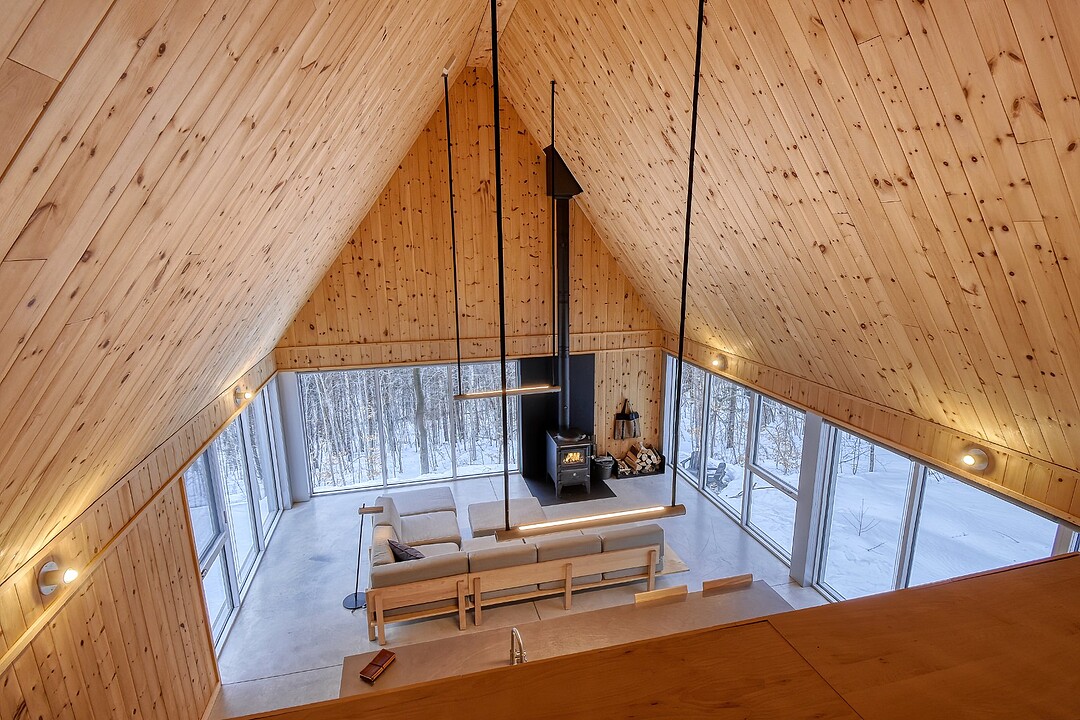 2e étage : - Spacieuse pièce de vie à aire ouverte, baignée de lumière naturelle et offrant une vue panoramique sur les montagnes et la nature environnante, avec très haut un plafond cathédrale. - Cuisine avec comptoir à déjeuner, grand espace de rangement et électroménagers de qualité - Salon avec foyer au bois à combustion lente - Salle d'eau - Salle de sauna vitrée, avec douche - Laveuse-sécheuse dissimulée dans une penderie