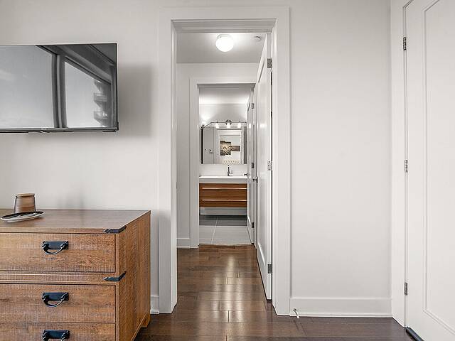 Ses atouts : - Cuisine contemporaine avec comptoir-lunch et rangements abondants, idéale pour cuisiner et recevoir - Aire ouverte conviviale regroupant salon, salle à manger et cuisine, offrant un espace chaleureux et lumineux - Boudoir fonctionnel, parfait pour un bureau à domicile ou un coin lecture cosy - Chambre principale spacieuse avec salle de bain attenante comprenant une douche à pluie vitrée et un généreux walk-in - Deuxième chambre lumineuse et bien proportionnée - Deuxième salle de bain élégante avec bain-douche moderne - Grand balcon privé, parfait pour se détendre ou profiter de l'extérieur - Hauts plafonds apportant aération et impression d'espace - Vaste fenestration inondant l'ensemble d'une lumière naturelle abondante - Un stationnement intérieur et un espace de rangement inclus