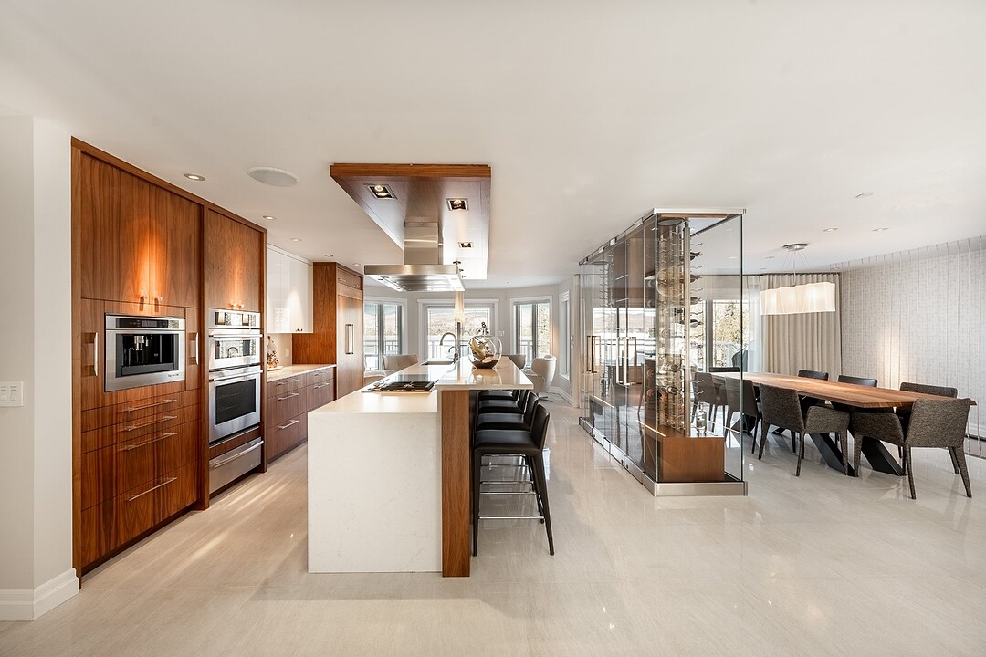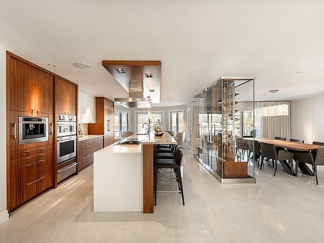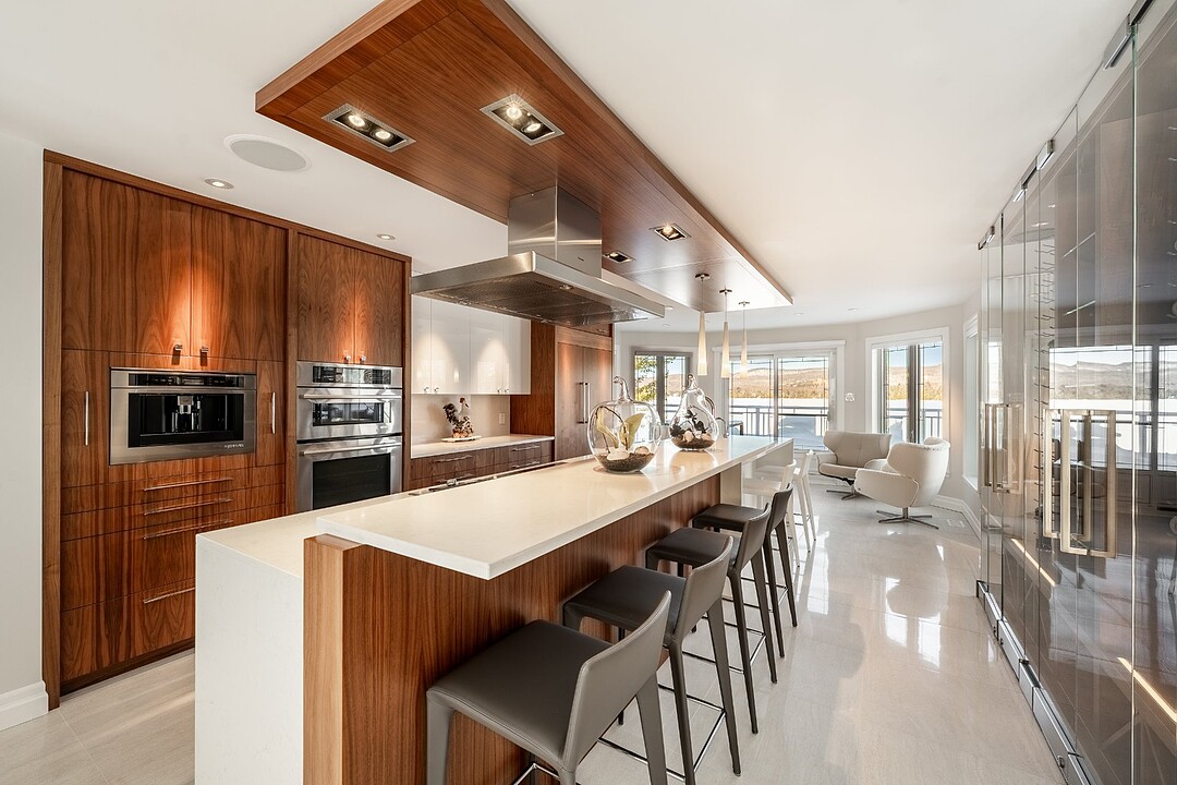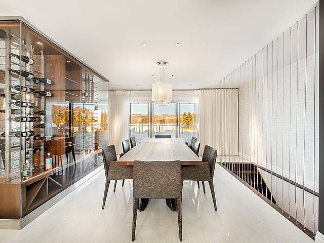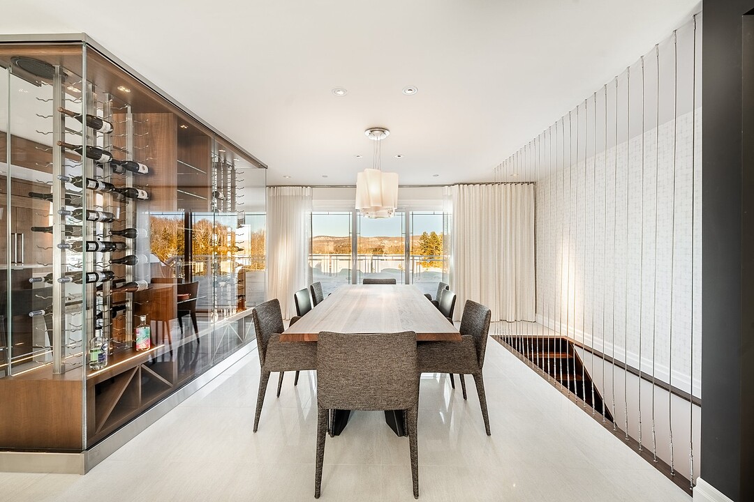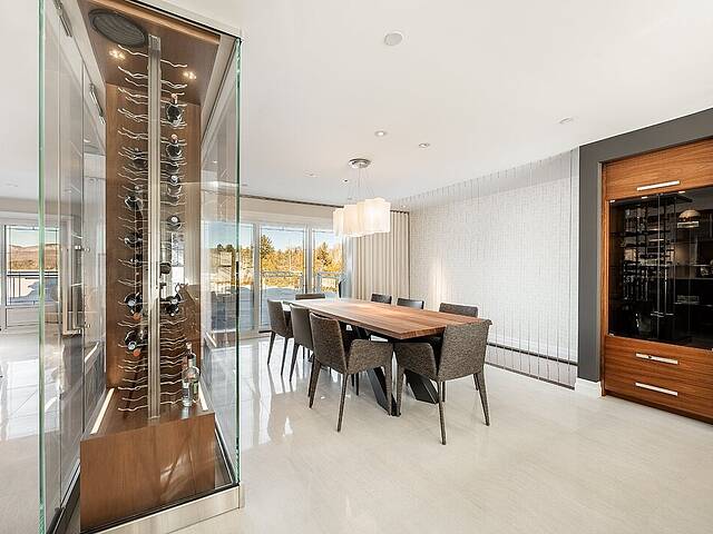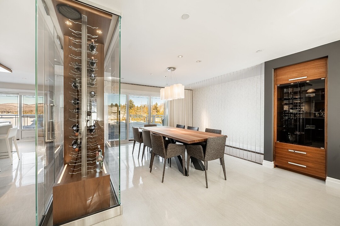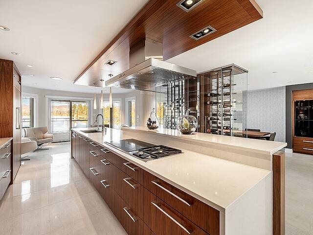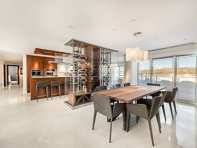La cuisine, vaste et soigneusement conçue, s'organise autour d'un imposant îlot avec coin dinette idéal pour les matins face au lac. Une cave à vin pouvant accueillir plus de 350 bouteilles s'intègre avec élégance. Son accès direct à un balcon permet de prolonger les repas vers l'extérieur et d'apprécier la vue en toute intimité.