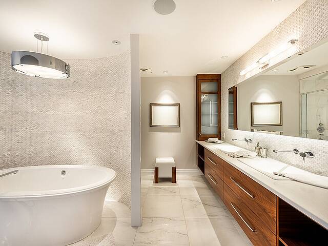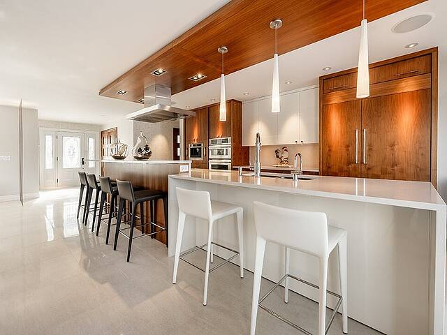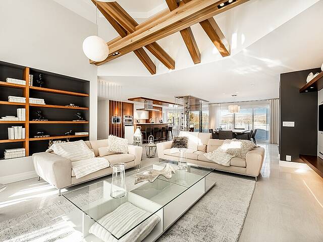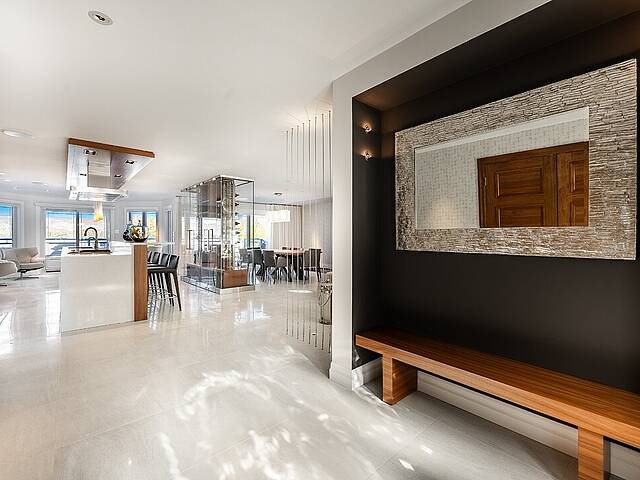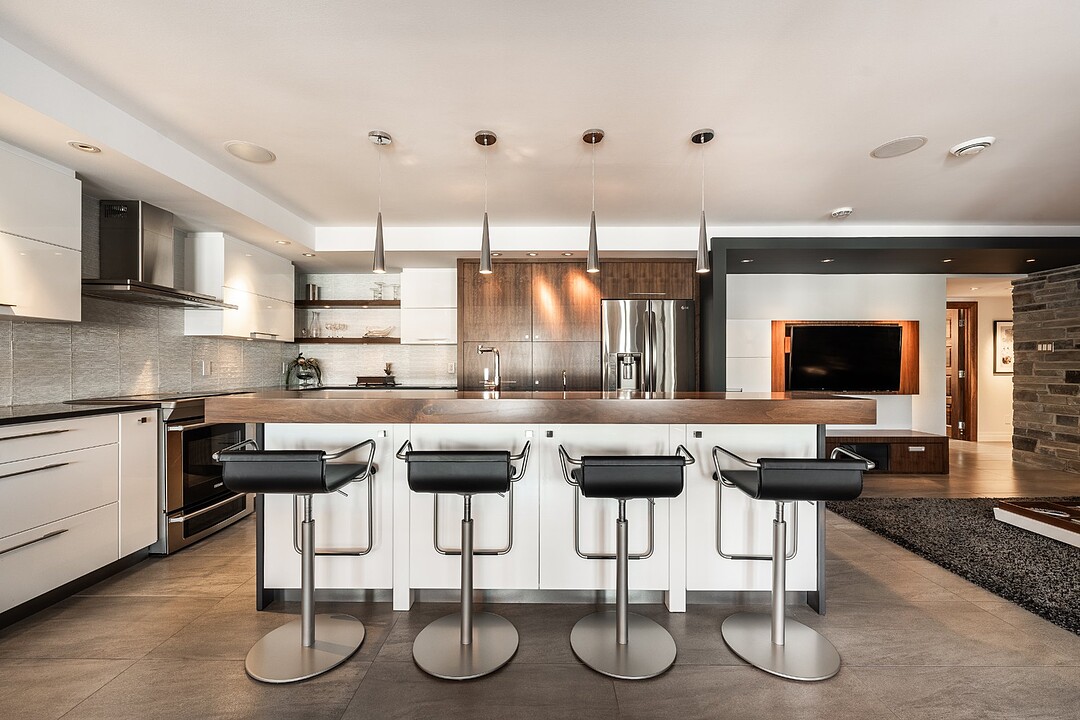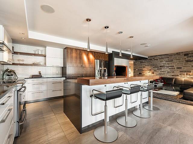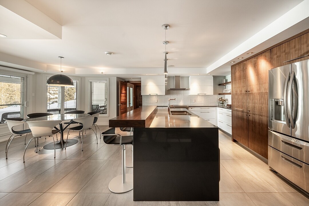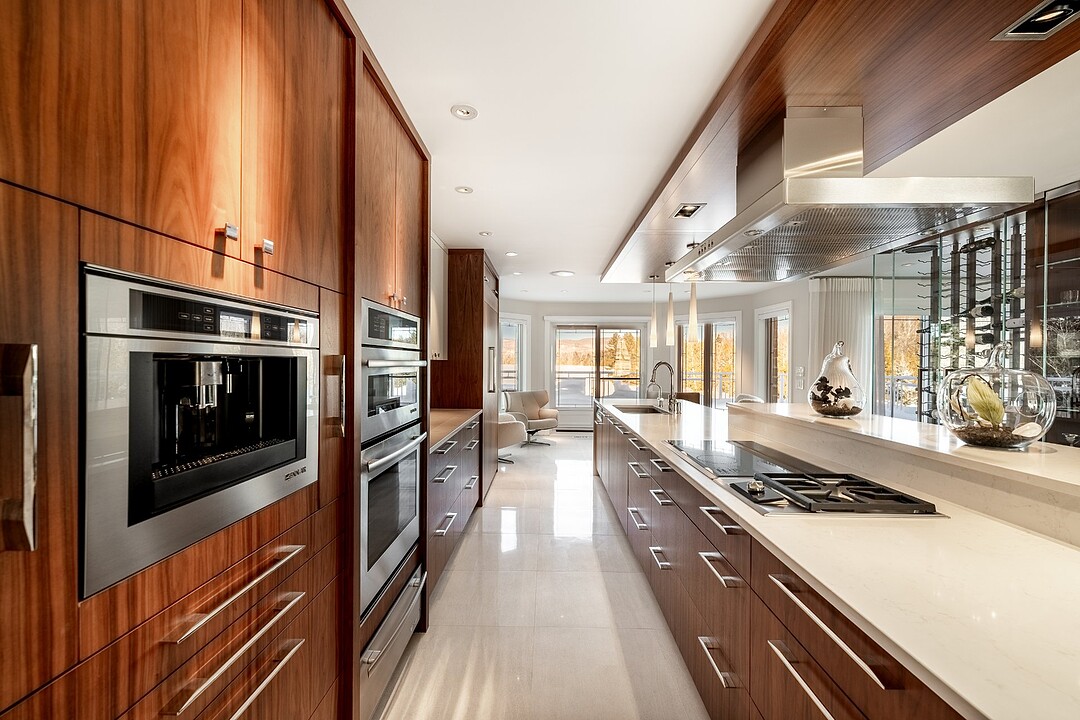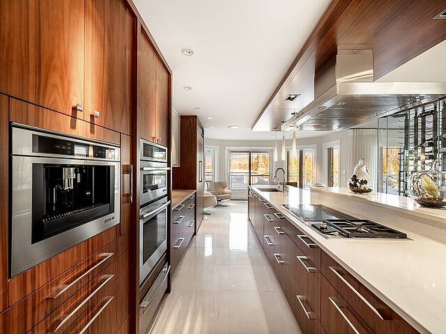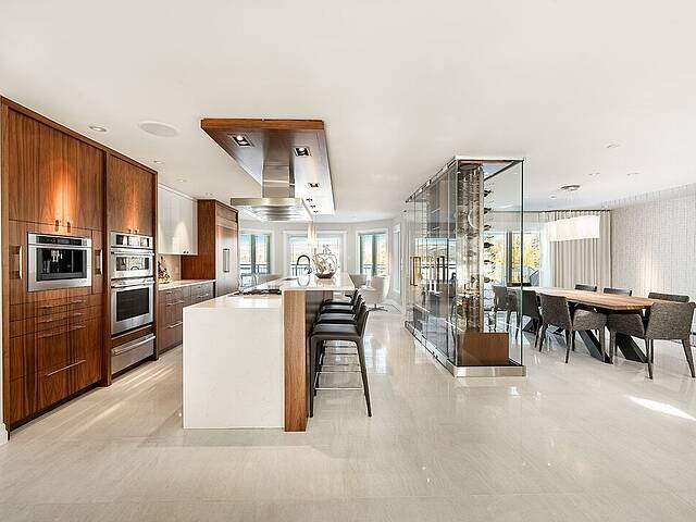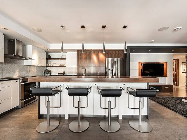 La cuisine, vaste et soigneusement conçue, s'organise autour d'un imposant îlot avec coin dinette idéal pour les matins face au lac. Une cave à vin pouvant accueillir plus de 350 bouteilles s'intègre avec élégance. Son accès direct à un balcon permet de prolonger les repas vers l'extérieur et d'apprécier la vue en toute intimité.