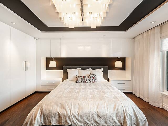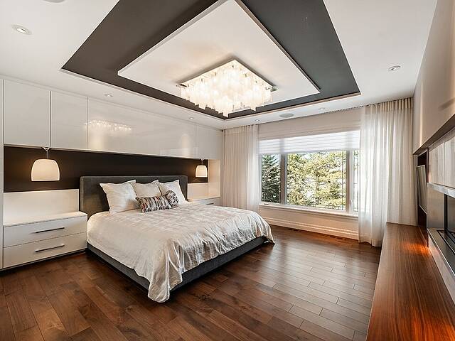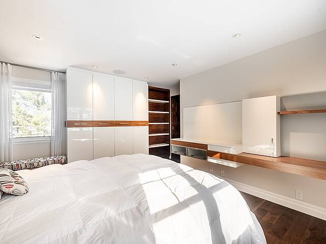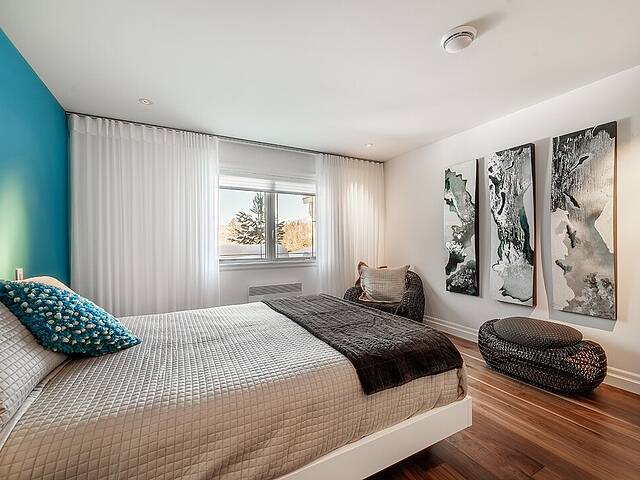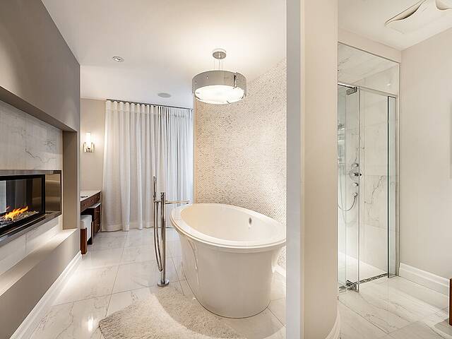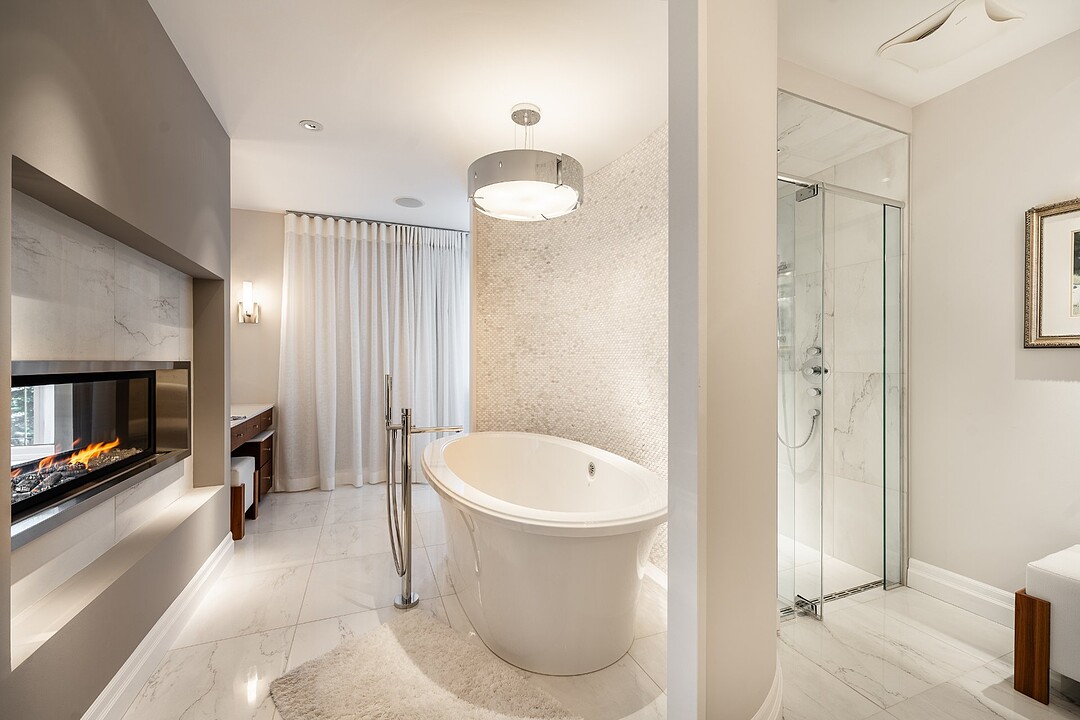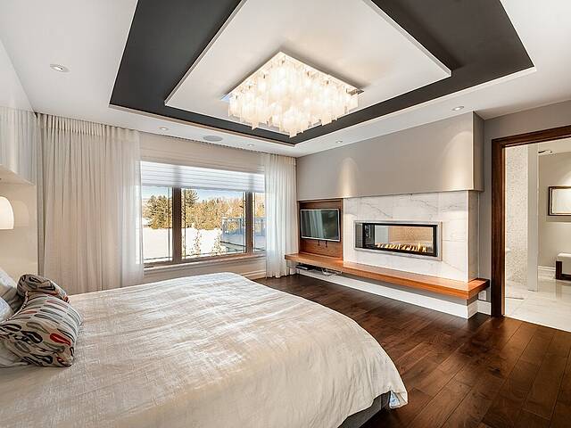 Au rez-de-chaussée, la suite principale orientée vers le lac constitue un véritable sanctuaire. Vue panoramique, foyer au gaz privé et salle de bain attenante composent un espace à la fois raffiné et apaisant.