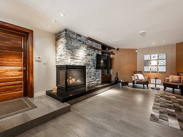 Au salon, le plafond de 13 pieds accentue l'ouverture vers l'eau. Le foyer au gaz, encadré de bois torréfié, apporte profondeur et chaleur à l'espace de vie principal.