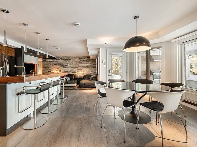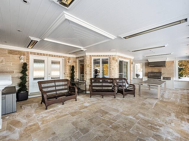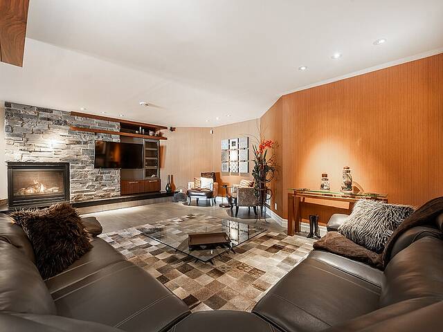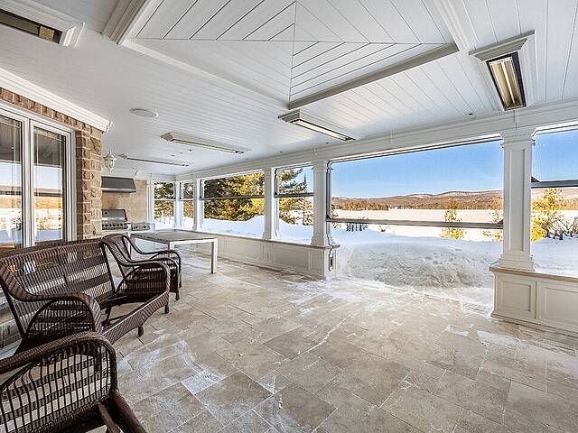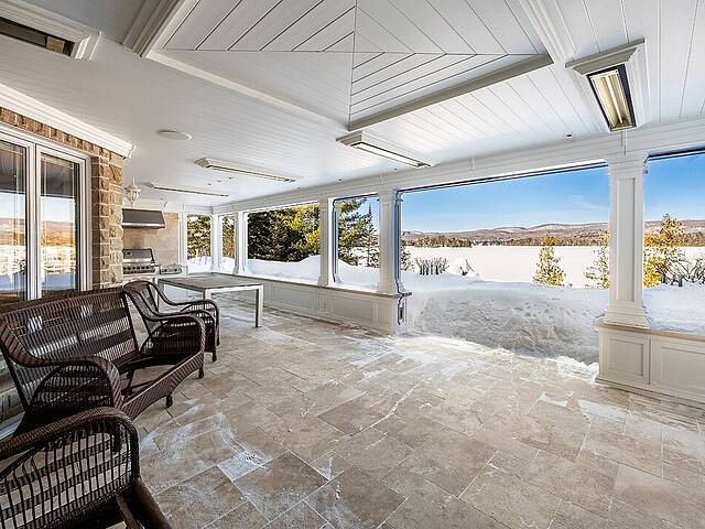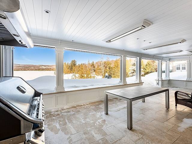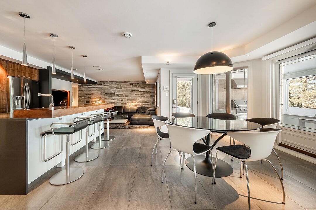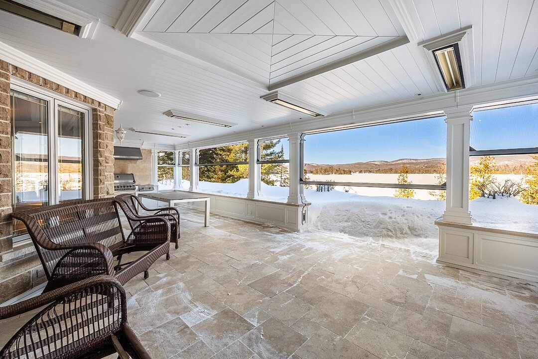 À l'extérieur, la terrasse aménagée agit comme une véritable pièce estivale. BBQ intégré, foyer au gaz, moustiquaires motorisées et chauffages au plafond permettent de recevoir confortablement du printemps à l'automne.