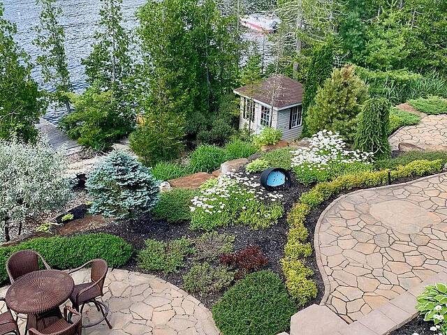 Le terrain de plus de 37 000 pieds carrés descend en paliers vers la plage privée, le quai et la descente à bateau pavée. Ici, le lac structure le quotidien.