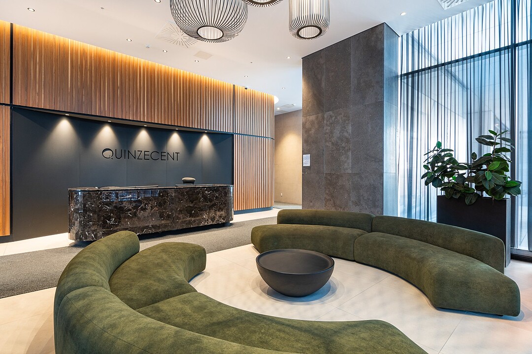 Les intérieurs du QuinzeCent, au style intemporel et offrant des vues exceptionnelles, se distinguent par un design raffiné et une attention minutieuse aux détails, créant un espace qui séduira ceux en quête d'un lieu à leur image.