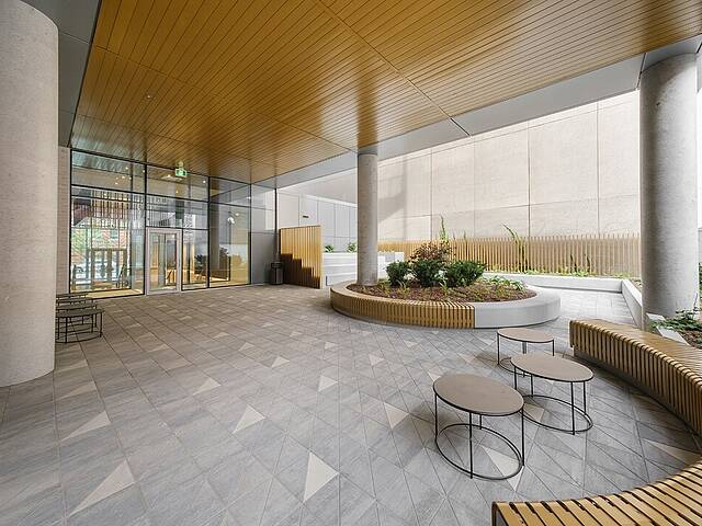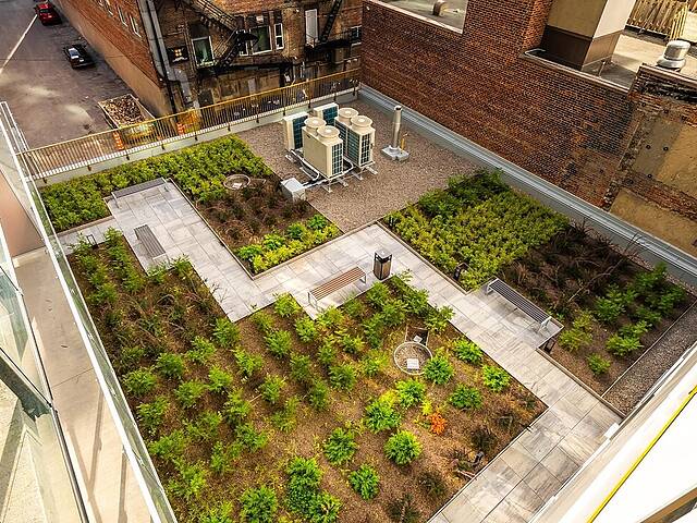 Services immeuble: -Cour intérieure aménagée par Lemay Architectes Paysagistes -Casiers pour la livraison des colis et casiers postaux