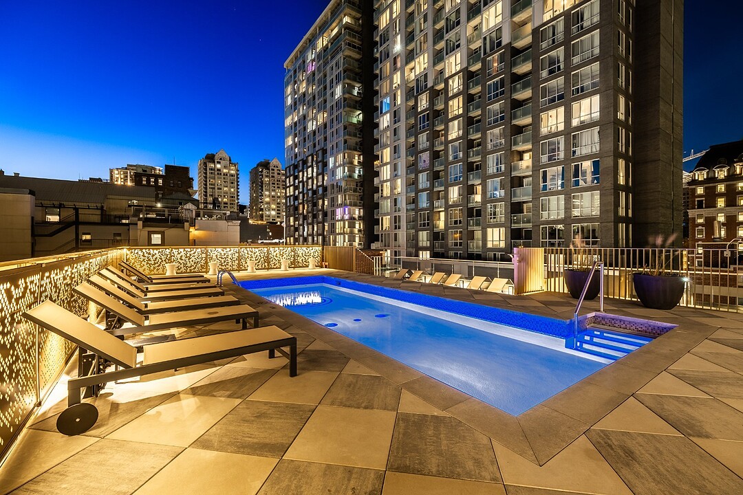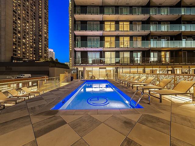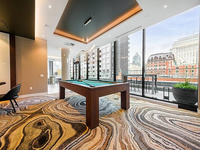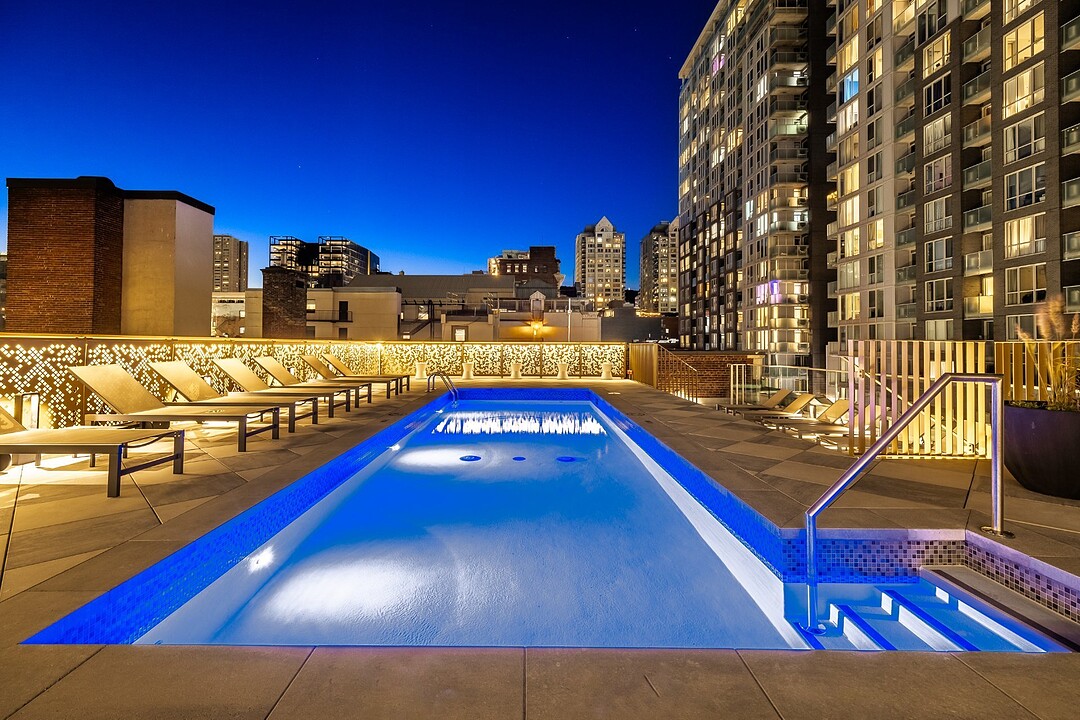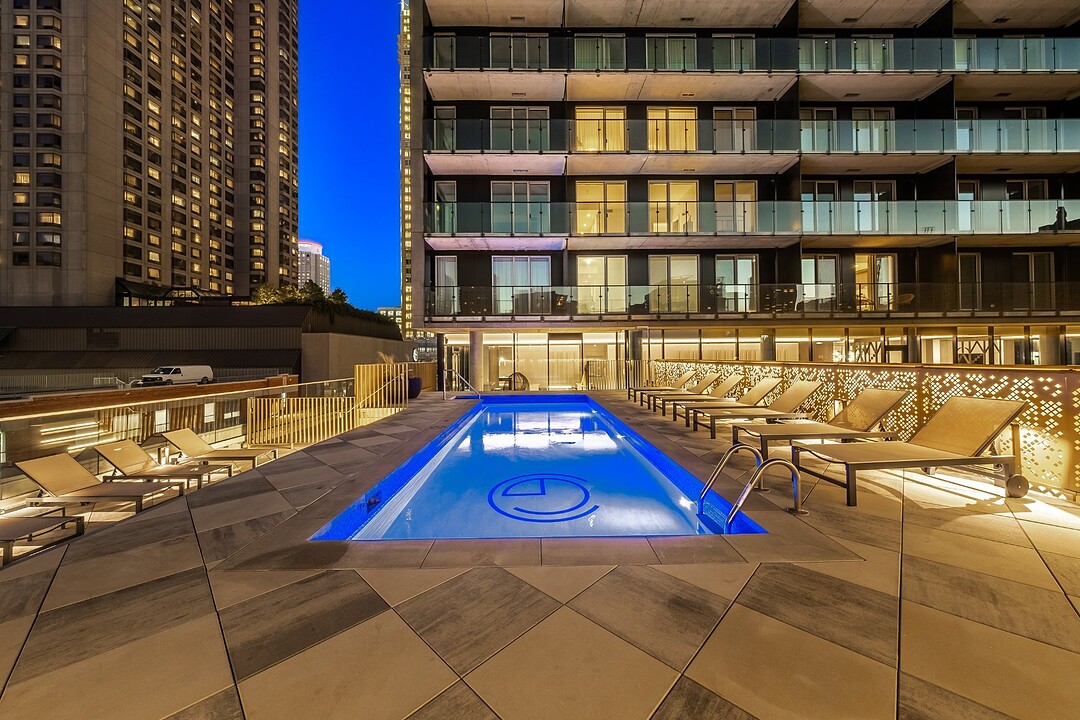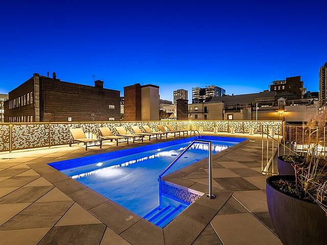 4e Étage -Terrasse aménagée avec piscine extérieure chauffée -Chalet urbain de 3 000 Pi2 avec foyer au gaz et espace bar -Salon de jeu avec table de billard, poker et plus
