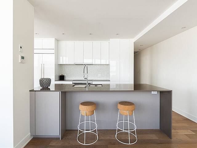 - Cuisine moderne, comptoirs en quartz, îlot central avec robinetterie haut de gamme
