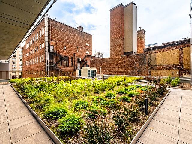 -Cour intérieure aménagée par Lemay Architectes Paysagistes -Casiers pour la livraison des colis et casiers postaux