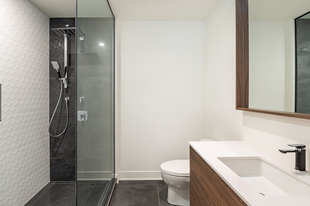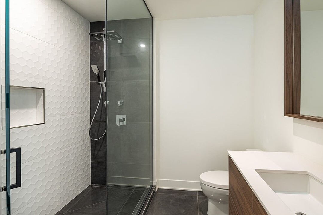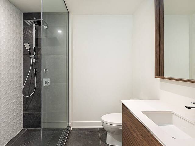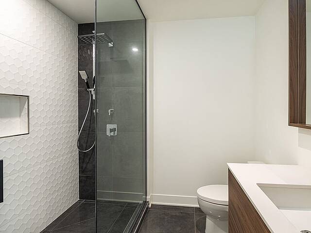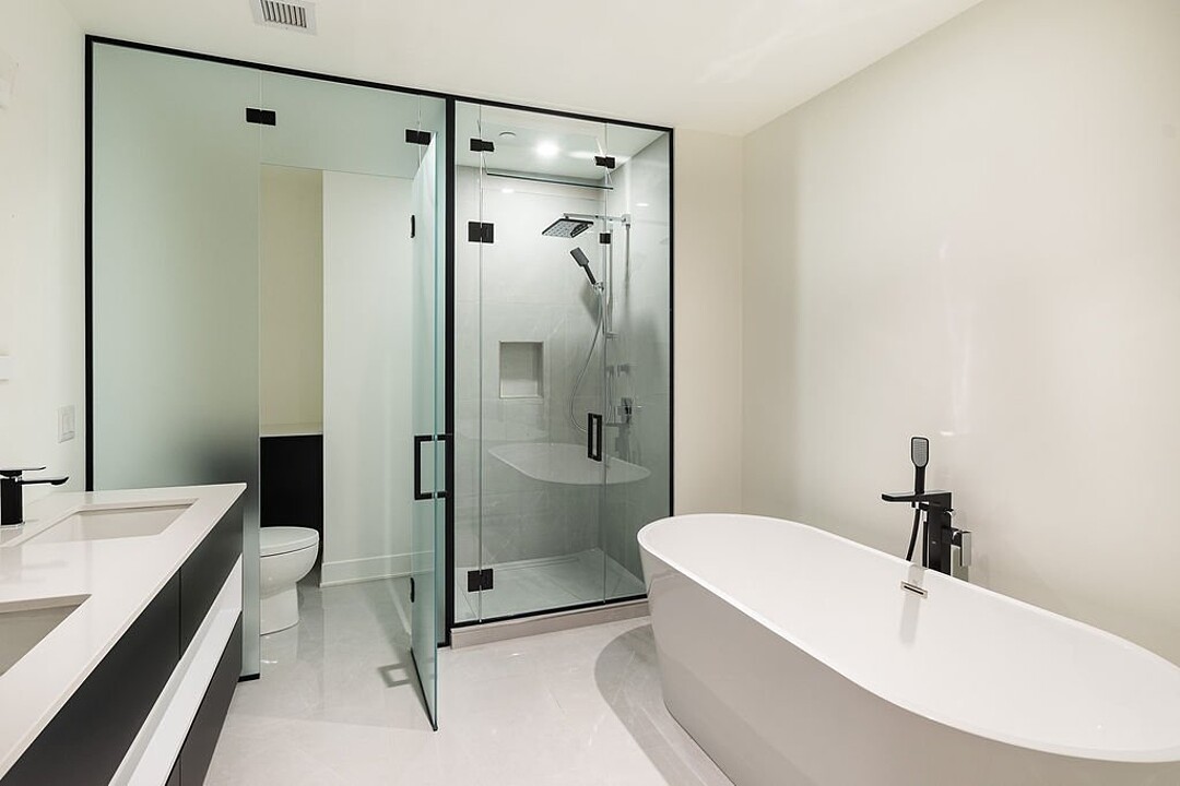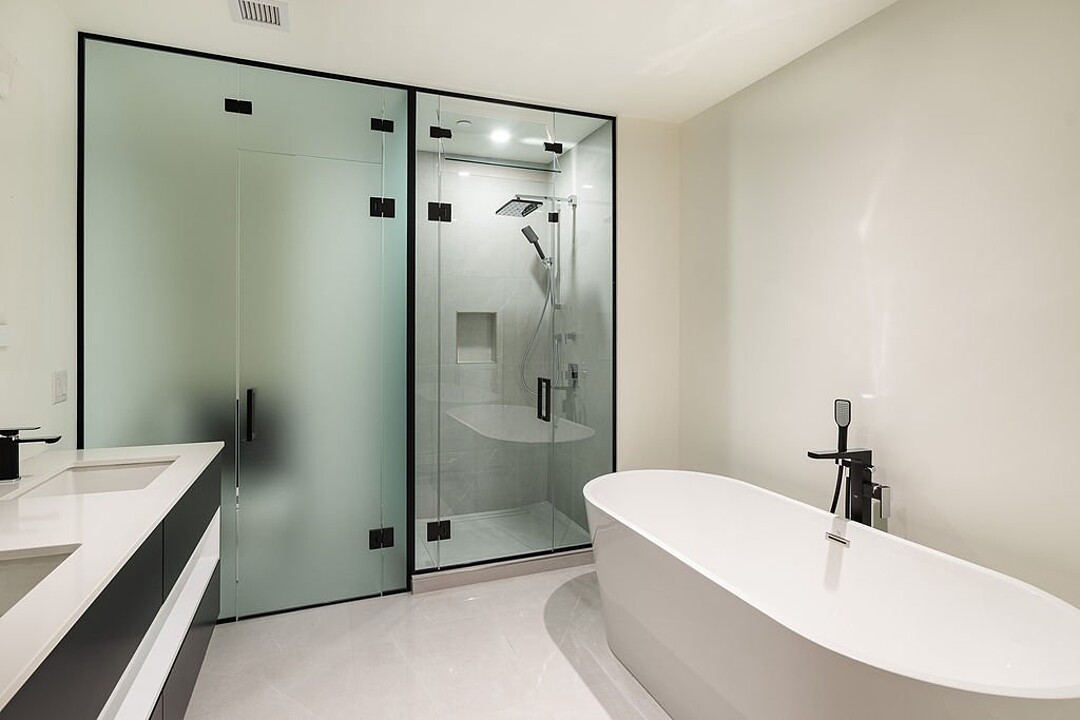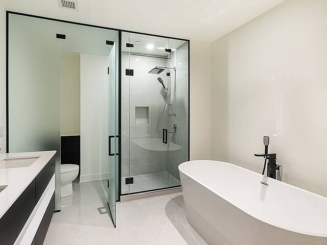 - Salle de bain design avec grande douche vitrée, lavabo double et robinetterie haut de gamme