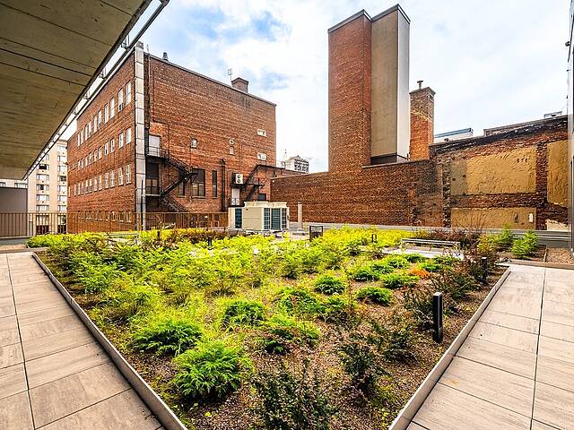 Services immeuble: -Cour intérieure aménagée par Lemay Architectes Paysagistes -Casiers pour la livraison des colis et casiers postaux