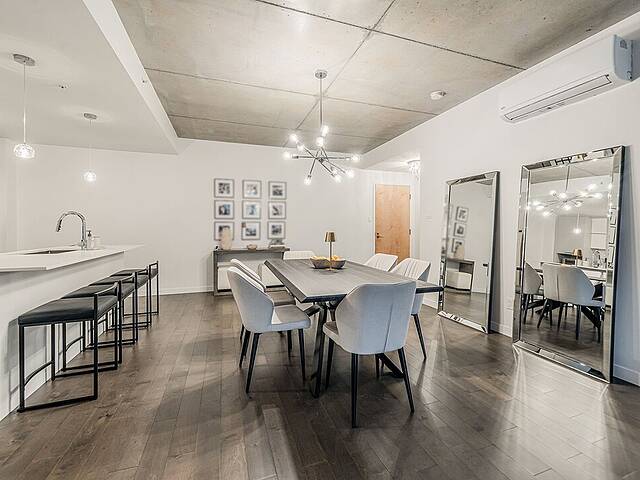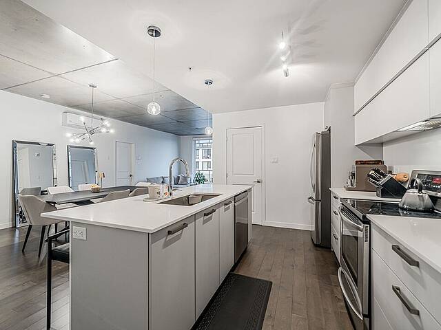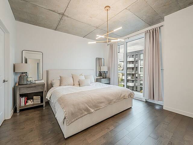 Beautiful apartment for rent in Pointe-Claire's Greenwich neighbourhood. This modern condo offers two (2) bedrooms and two (2) bathrooms, an indoor parking space, and a storage area. You'll appreciate the 9-foot concrete ceilings and generous floor-to-ceiling windows that fill the space with natural light. The contemporary kitchen, with a central island, opens onto a welcoming living area, perfect for entertaining or relaxing. The building features two heated pools with landscaped terraces, a gym, and bicycle storage. Conveniently located near shops, services, public transportation, and the future REM station.