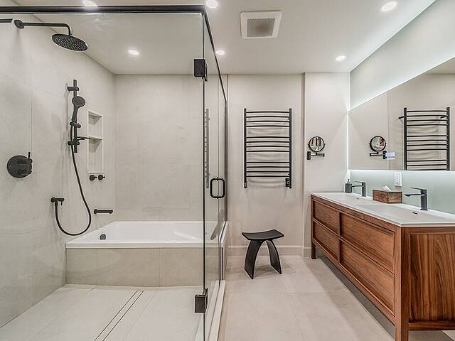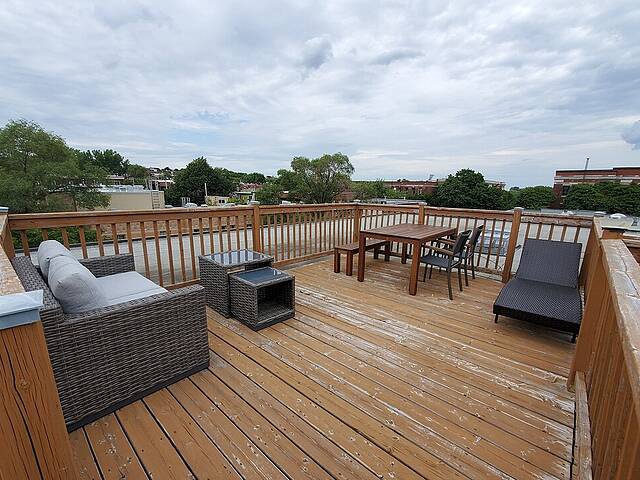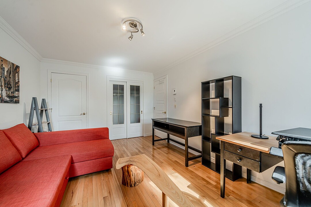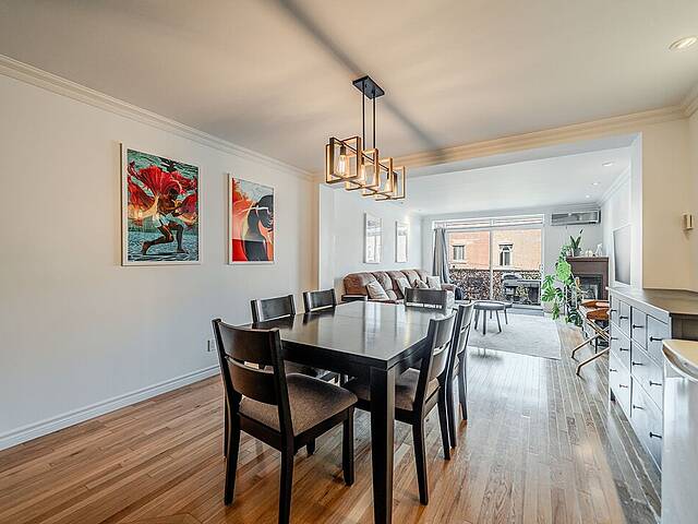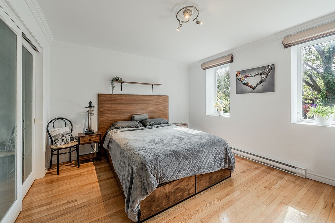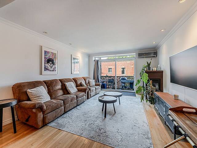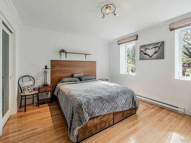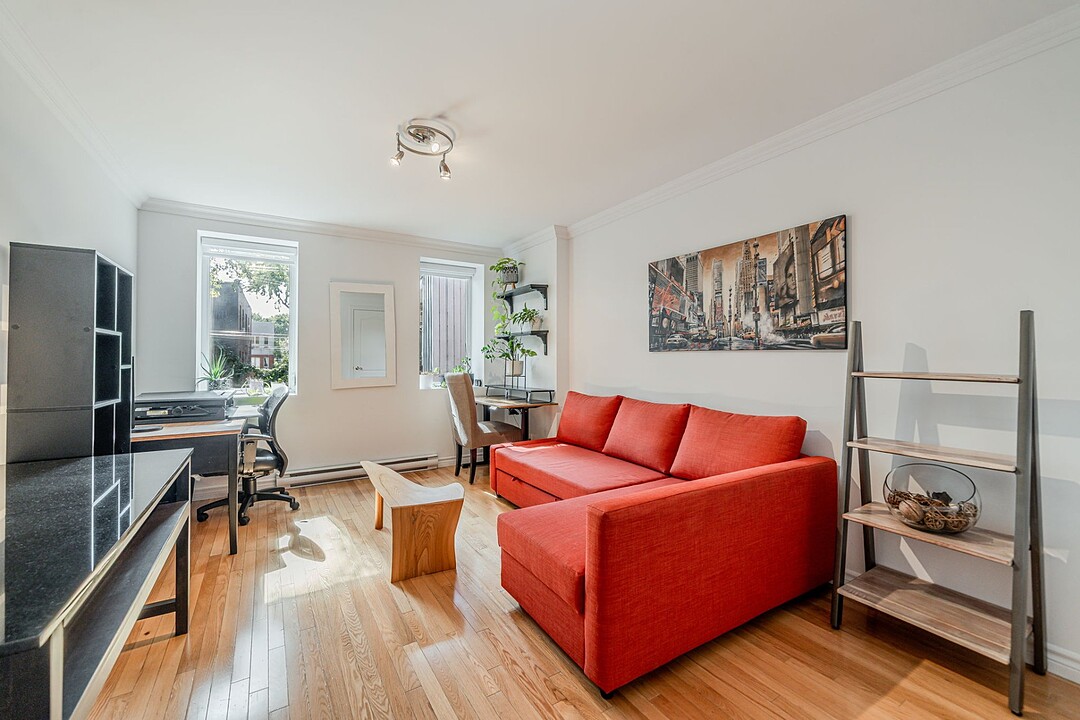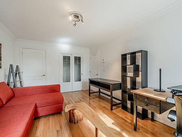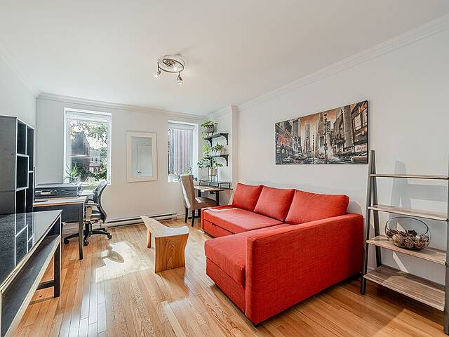 Spacious furnished apartment located in Central Montréal. With nearly 1,400 sq. ft., it offers 2 bright and comfortable bedrooms, along with a versatile den that can serve as an office or additional bedroom. The living room, adjacent to the dining area, opens onto an inviting open-concept space. The functional kitchen includes a breakfast counter and ample storage. The bathroom is stunning, with a glass-enclosed shower and separate tub. Warm wood floors and high ceilings create an airy atmosphere. Just minutes from local shops, restaurants, Frontenac metro, and Downtown, a perfect urban lifestyle.