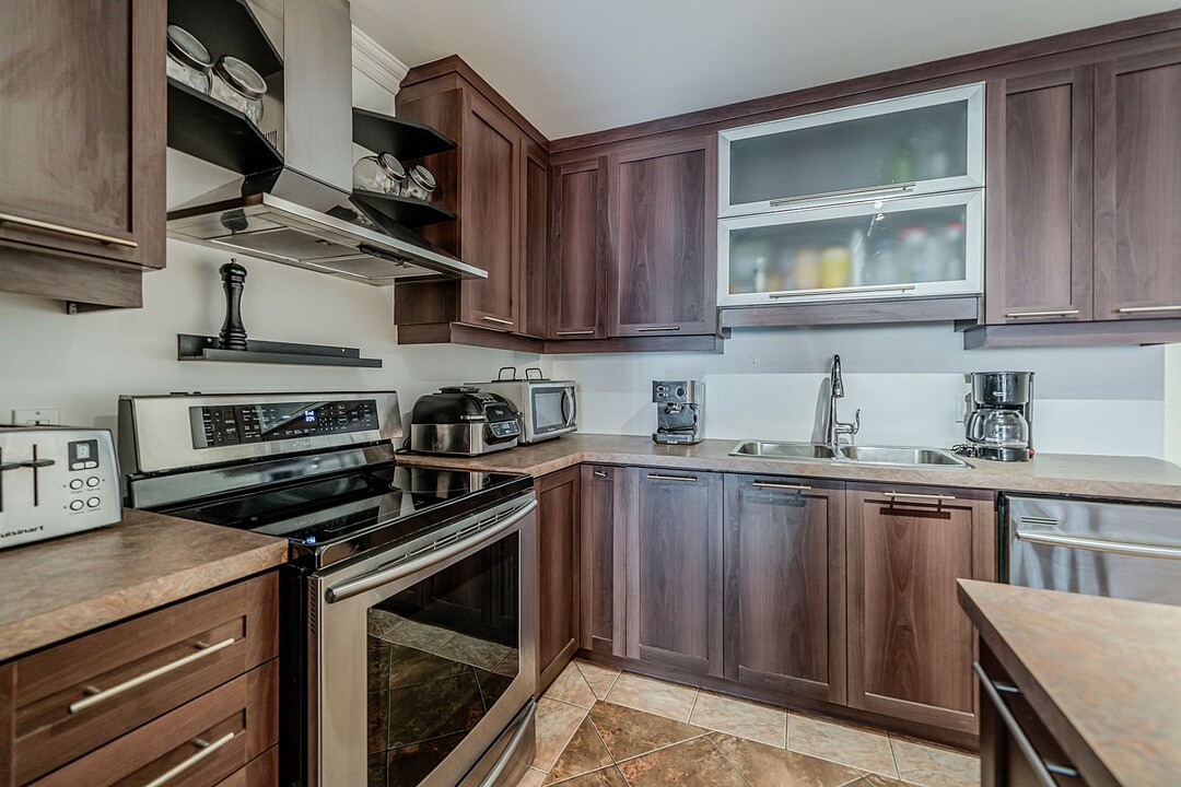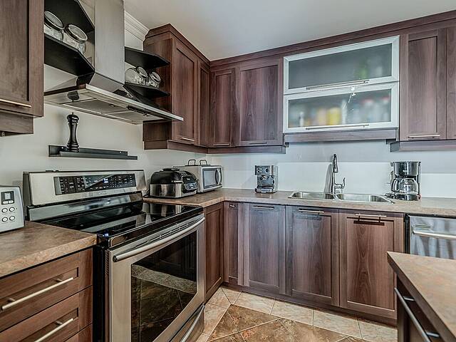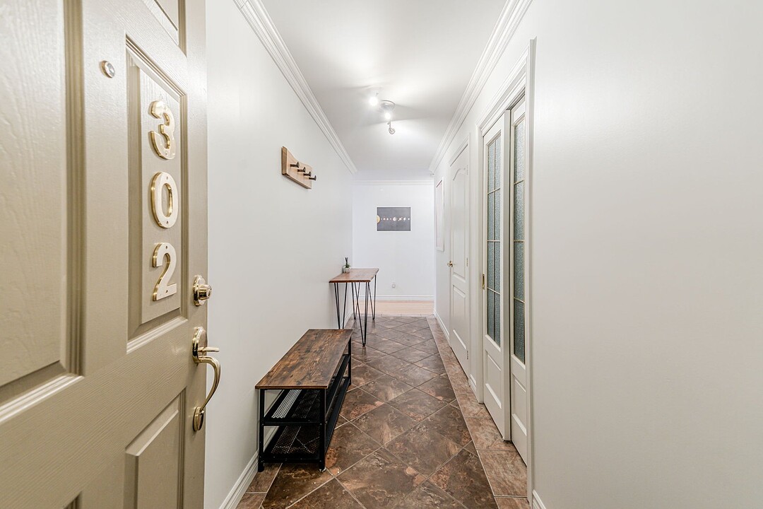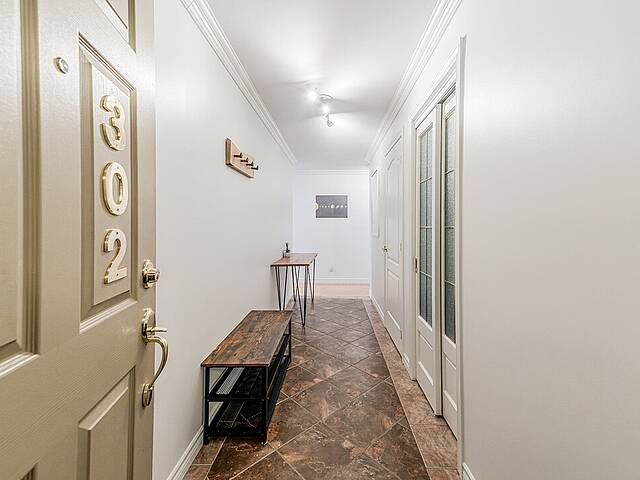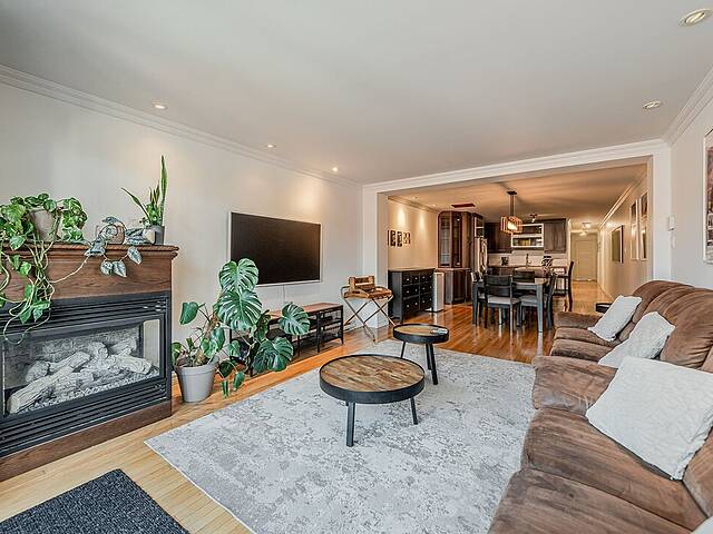 Highlights: - Functional kitchen with plenty of storage and central island - Dining area located at the center, perfect for socializing - Large bright living room with electric fireplace and patio door leading to the balcony - Master bedroom with large double closet - Second bedroom with sofa bed and workspace, plus double closet - Versatile den that can serve as an office or small third bedroom (washer and dryer integrated in the closet) - Modern bathroom with double vanity, glass-enclosed shower, and separate bathtub - High ceilings with decorative moldings, adding character and charm - Hardwood and ceramic floors, easy to maintain - Rooftop private terrace