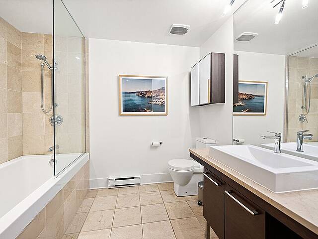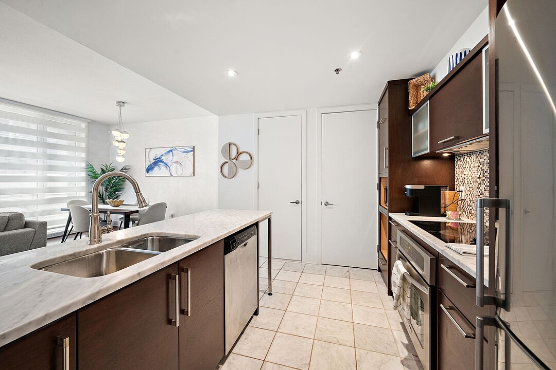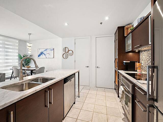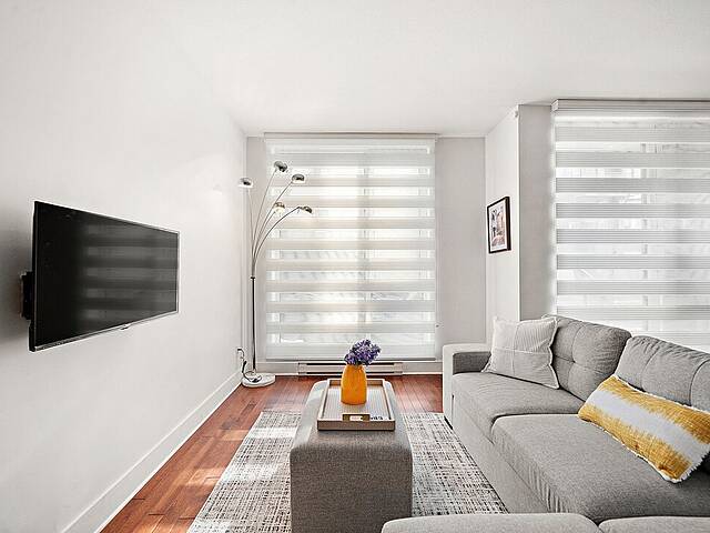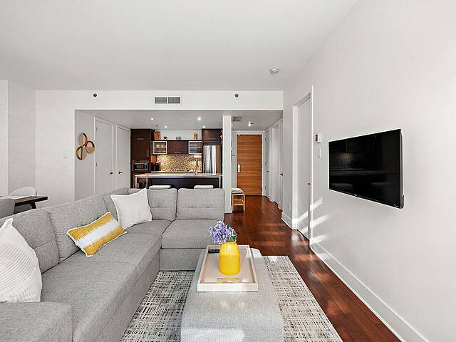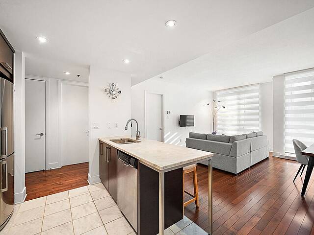 Beautiful apartment for rent in Old Montreal. The unit features a bright open-concept layout with large windows that flood the space with natural light. The kitchen is both elegant and practical, with marble surfaces. The condo includes a comfortable primary bedroom, a modern bathroom, and a private balcony with open views. Located in the prestigious Solano building, residents enjoy upscale amenities including indoor and outdoor pools, a gym, an indoor garden, and a rooftop terrace. Prime location, just steps from downtown and the Champs-de-Mars and Berri-UQAM metro stations.