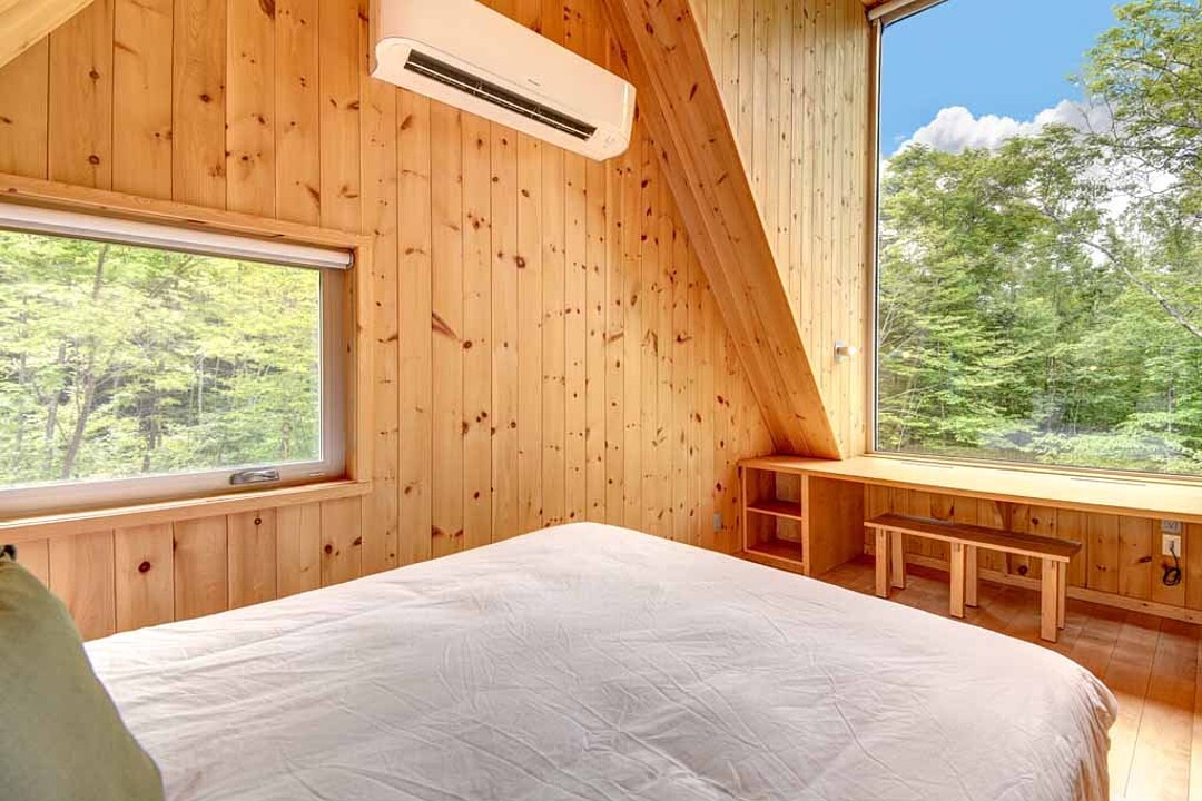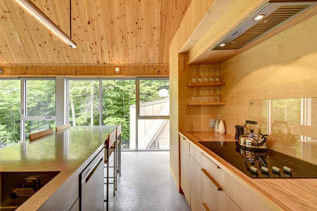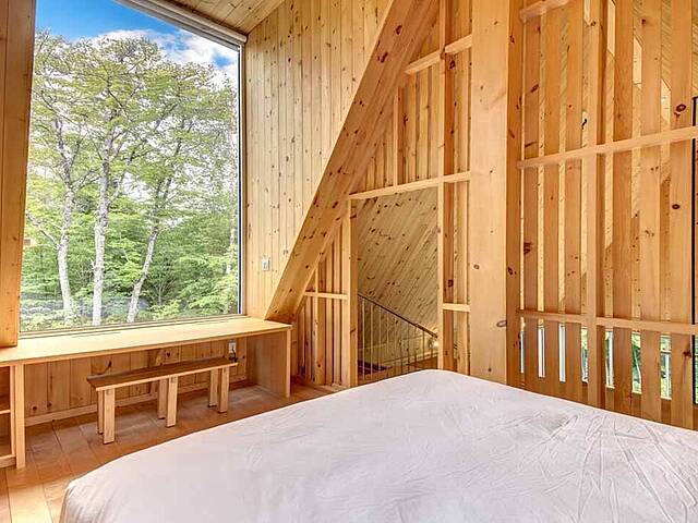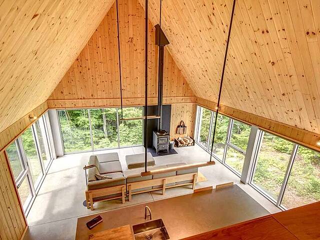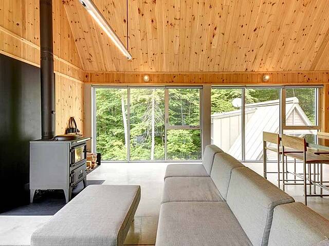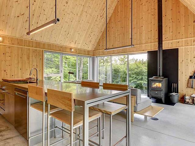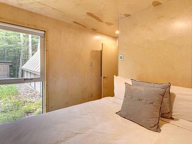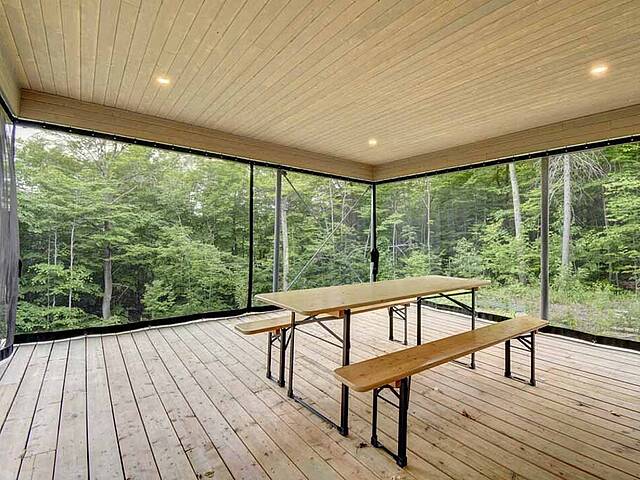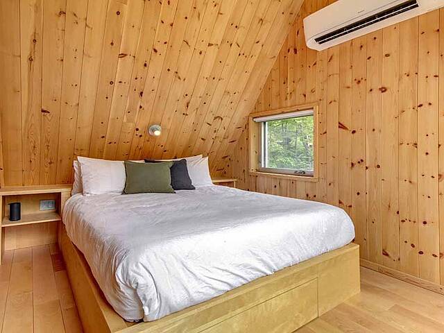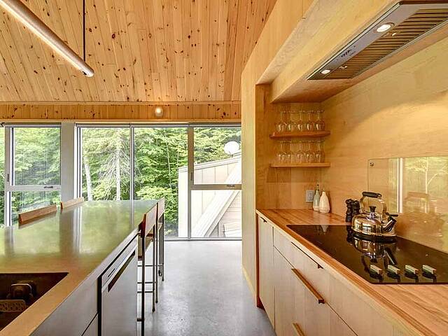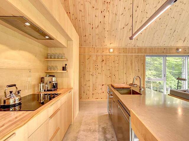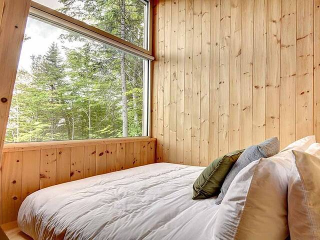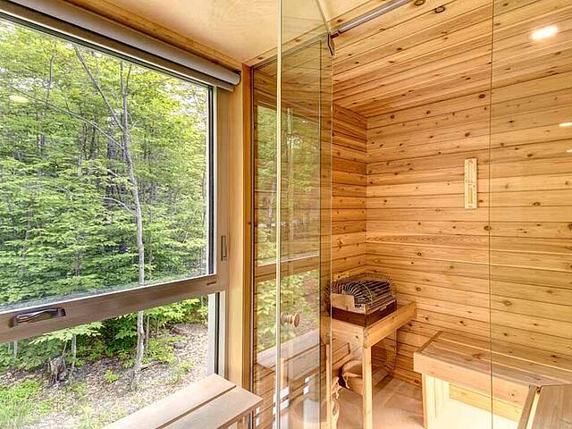High-Quality Construction: -Custom kitchen and furniture by À Hauteur d'Homme -Lighting fixtures by Lambert & Fils -Esse wood stove and range, combining aesthetics and performance -Heated floors with thermostatic control -Exterior cladding in cedar siding by Juste du Pin (50-year warranty) -Oversized aluminum windows, steel door, and sealed glass by Fabelta -MAC Métal standing seam metal roof -Intermat hardware -Riobel faucets (a Québec-based company) -Air exchanger and wall-mounted AC -POD ceiling fan -Smart keypad lock -Electric vehicle charging station