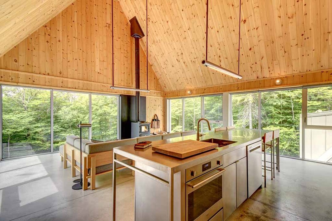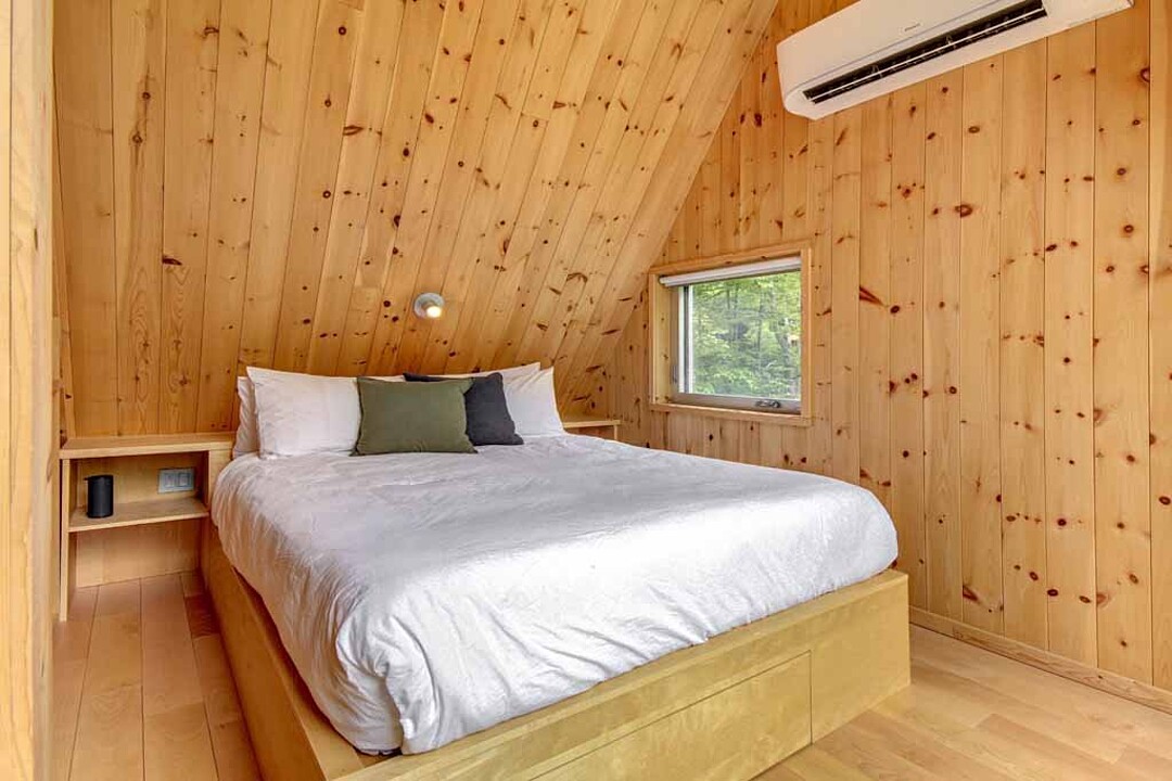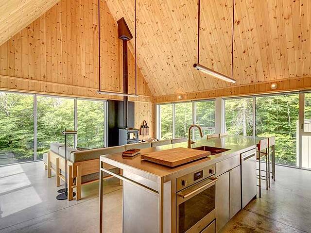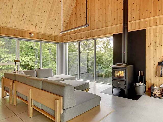 High-Quality Construction: -Custom kitchen and furniture by À Hauteur d'Homme -Lighting fixtures by Lambert & Fils -Esse wood stove and range, combining aesthetics and performance -Heated floors with thermostatic control -Exterior cladding in cedar siding by Juste du Pin (50-year warranty) -Oversized aluminum windows, steel door, and sealed glass by Fabelta -MAC Métal standing seam metal roof -Intermat hardware -Riobel faucets (a Québec-based company) -Air exchanger and wall-mounted AC -POD ceiling fan -Smart keypad lock -Electric vehicle charging station
