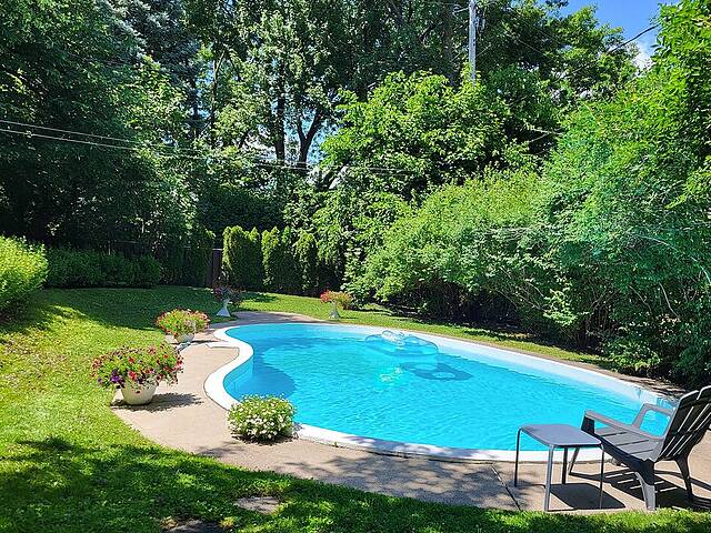 Charming home with unique character in the sought-after Cité Jardin area of Rosemont. Bright and welcoming, it features four bedrooms, two bathrooms, and a powder room. The modern kitchen with breakfast bar is functional and offers ample storage. The dining room and spacious living room are separate, with hardwood floors throughout the main and upper levels. The basement includes a large family room, powder room, laundry area, and storage, with an attached garage. Outside, a landscaped, fenced yard with a pool. Close to the Botanical Garden, Parc Maisonneuve, and municipal golf course. A true must-see!