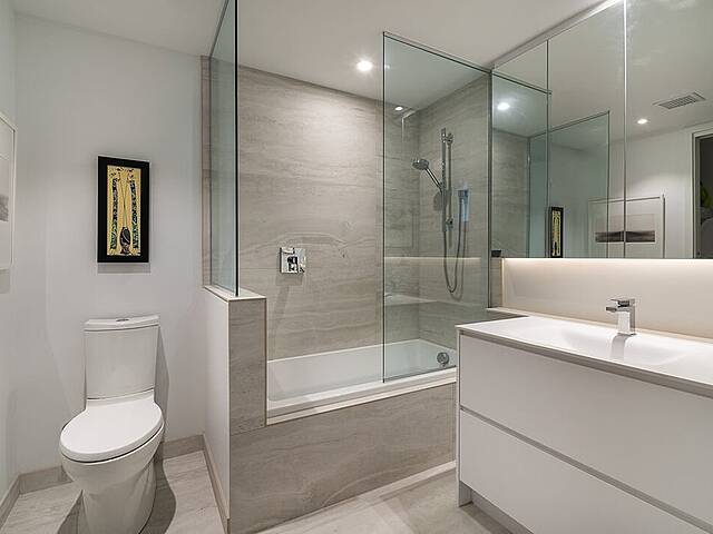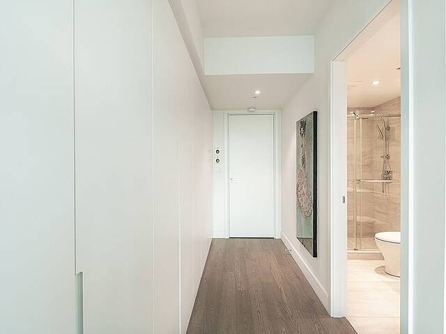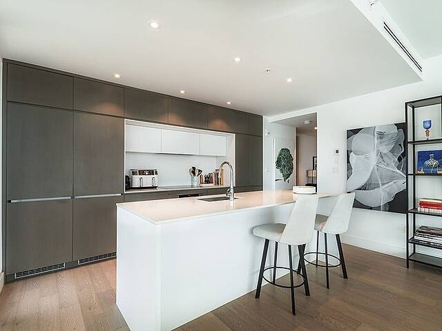 Premium finishes and features, including: - Engineered wood flooring - Custom built-in storage in the bedrooms and entry hall - Quartz kitchen countertops, backsplash and island - Integrated kitchen appliances - Dedicated enclosed space for washer and dryer - Recessed lighting and LED lighting under bathroom vanities - Bathrooms with sleek vanities featuring molded Corian countertop sinks - Full-height medicine cabinets with mirrored doors - Front door and all unit doors made of solid wood