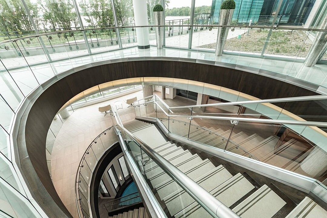 The building stands out with: - Expansive panoramic windows - Three elevators - Concrete construction - Automatic sprinkler system