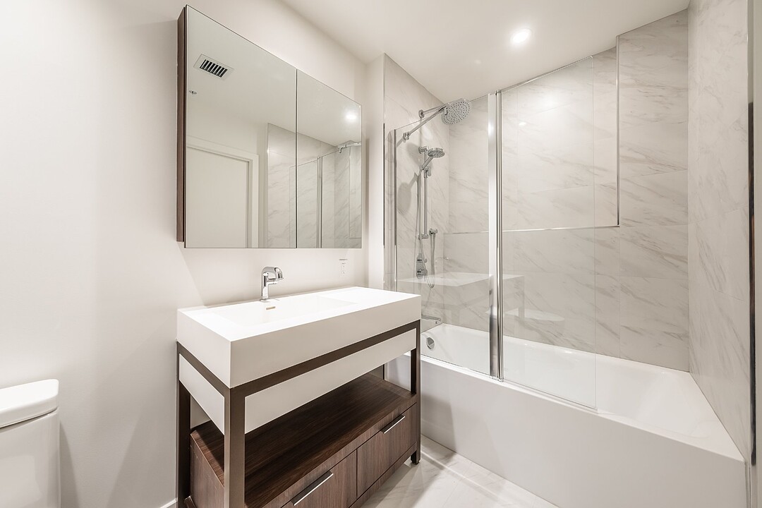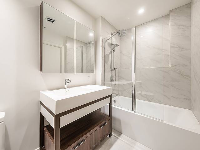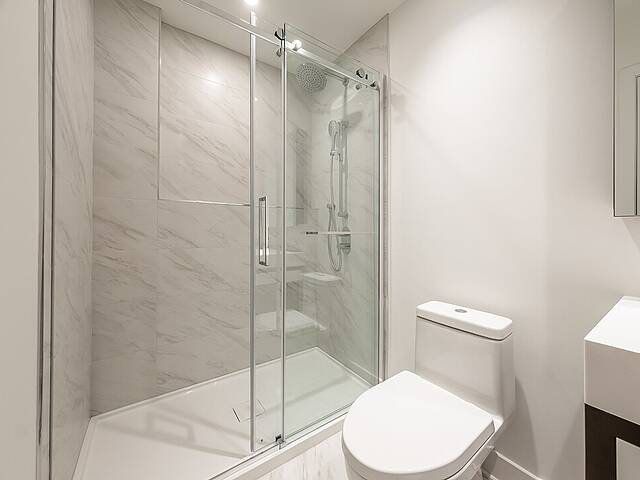 Units: -Porcelain, Dekton, or quartz countertops and backsplash -Exposed concrete ceilings -9-foot ceiling height, primarily in living spaces -Quality acoustic soundproofing -Double-energy glazed windows with sealed units, low-e, and argon -Air exchanger included in each unit -Concealed air conditioning with roof condensers for 1 to 3-bedroom units -Architectural electric baseboard heating connected to digital thermostat -Pre-wiring for telephone, cable, and internet -Included lighting fixtures: recessed in the kitchen, entrance hall and bathrooms; functional lighting for laundry rooms and walk-ins -Gypsum-covered concrete columns -Condo delivered with 2 coats of white paint -Private balconies with glass railings for most units -Secure lock with Medeco key