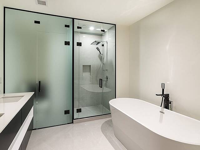- Designer bathroom with large glass shower, linear drain, vanity unit with integrated storage and double sink, high-end faucet