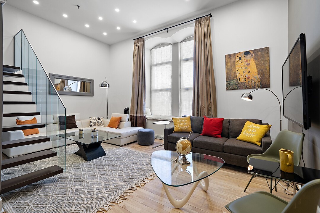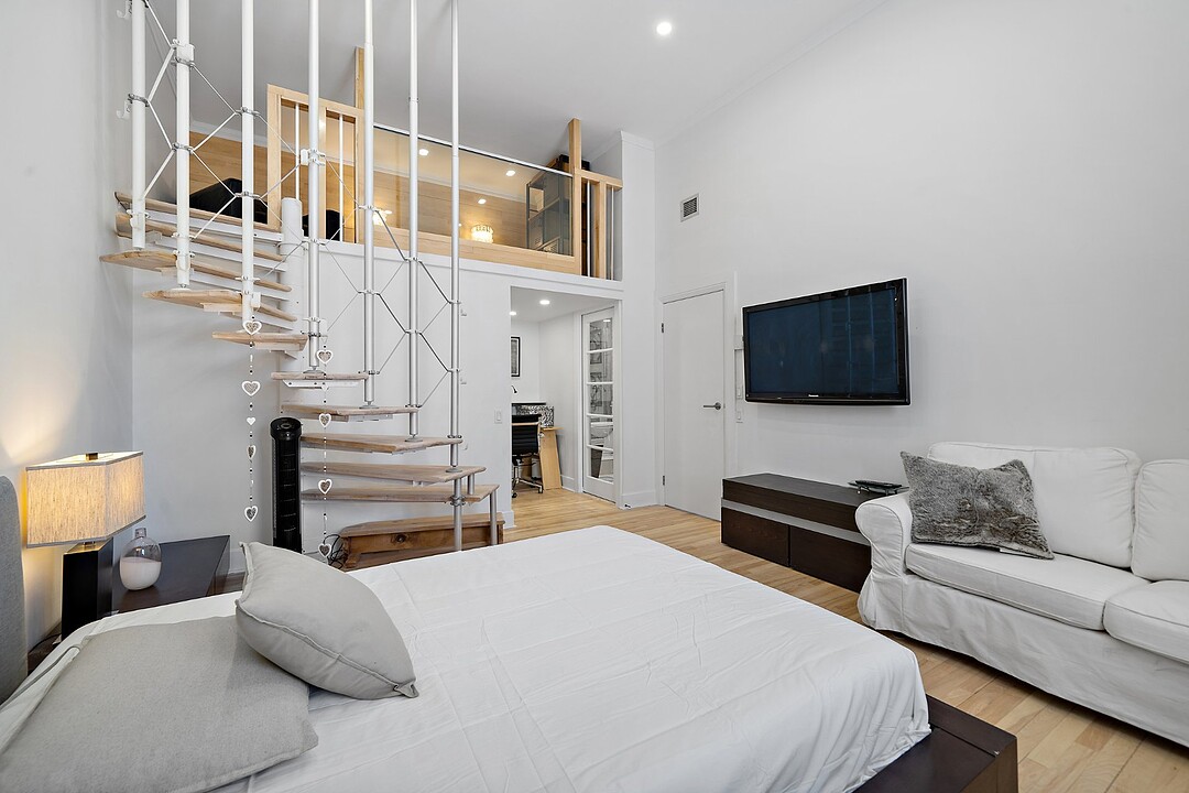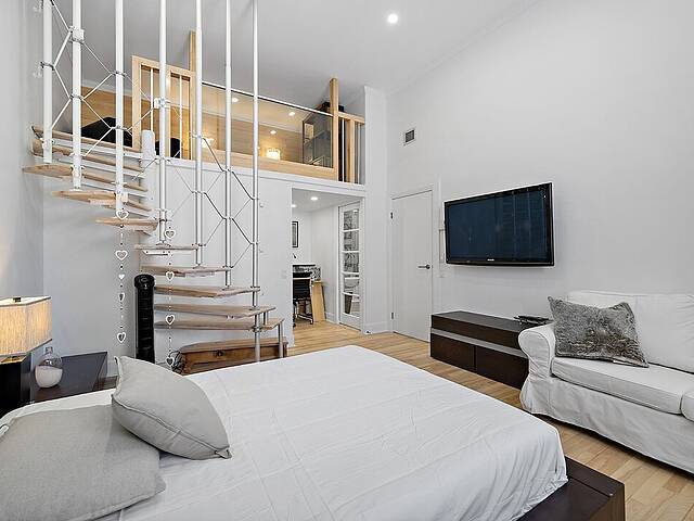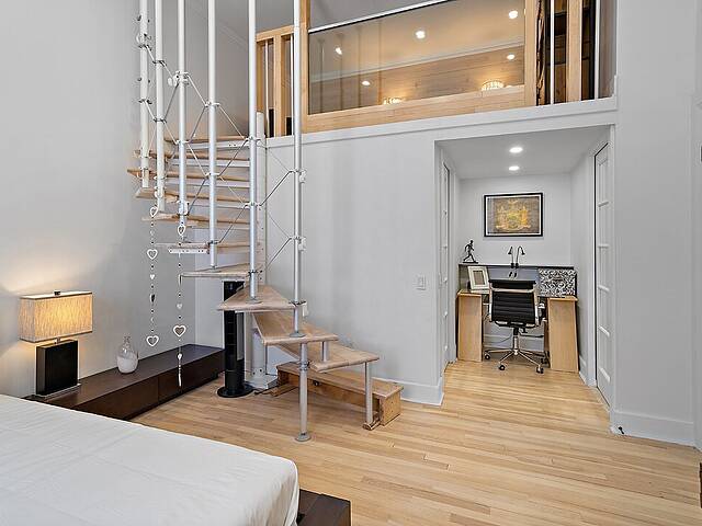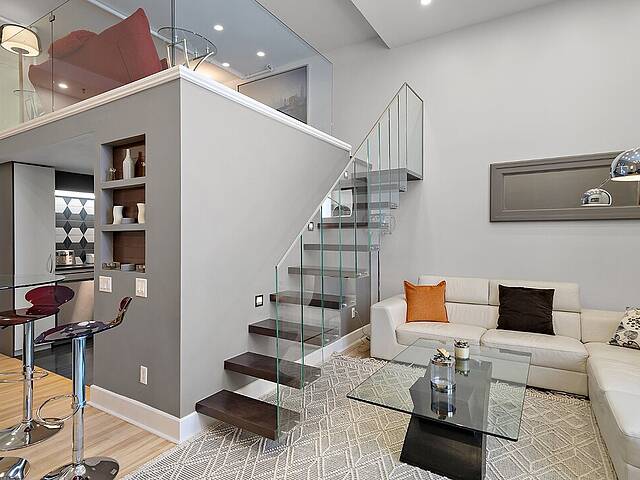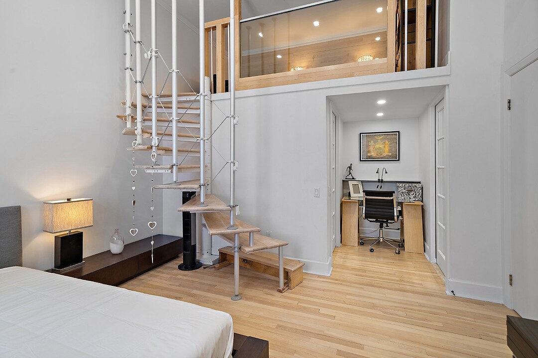 - A modern and functional kitchen - Cozy living and dining areas - A mezzanine overlooking the living and dining areas - Primary bedroom with a mezzanine, en suite bathroom, and walk-in closet - Second generously sized bedroom with double closets - Contemporary second bathroom - A convenient powder room - Expansive windows allowing for abundant natural light - High ceilings for enhanced airflow and a spacious feel - Two contemporary staircases--one in the main living area and one in the primary bedroom--adding an elegant architectural touch throughout the condo - Laundry room with storage and utility sink - One indoor parking space and a storage locker