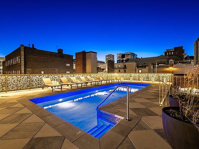 4th Floor: -Landscaped terrace with heated outdoor pool -3,000 sq ft urban chalet with a gas fireplace and bar area -Game lounge with pool table, poker, and more