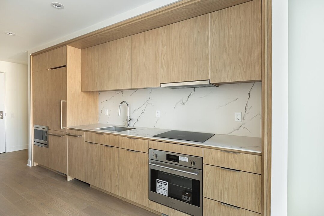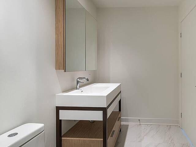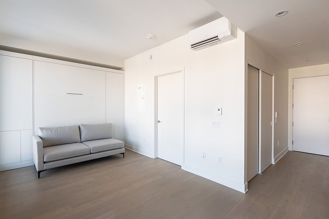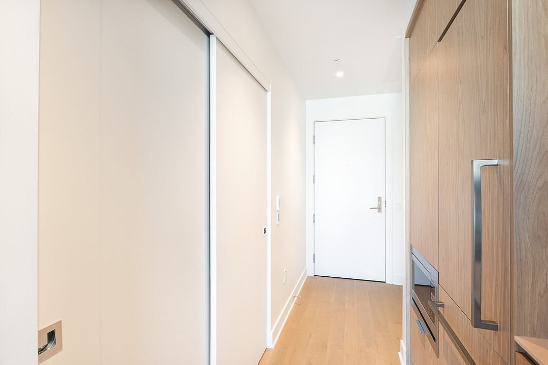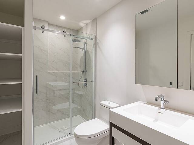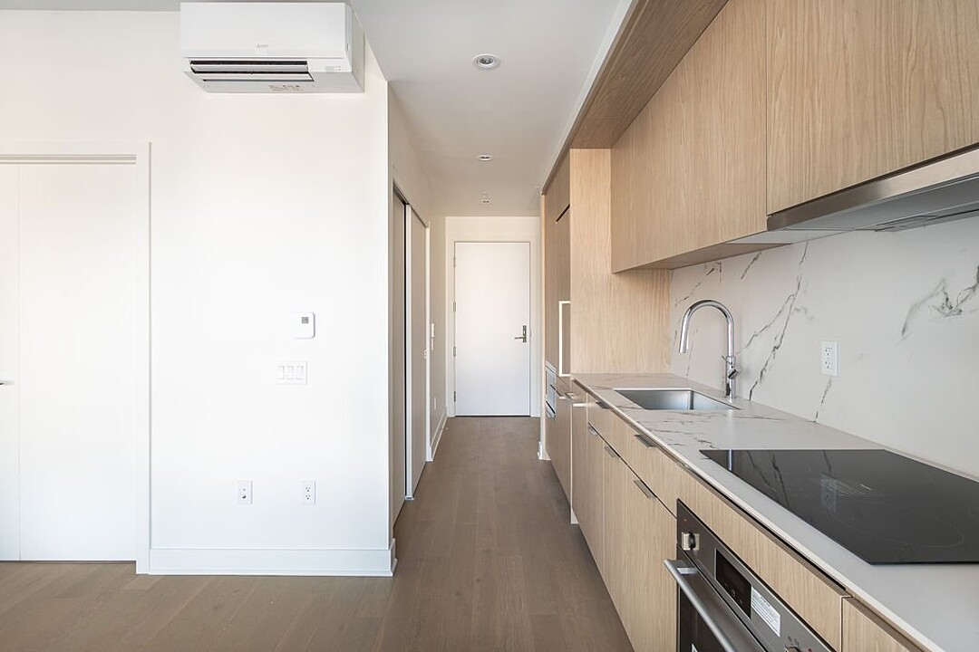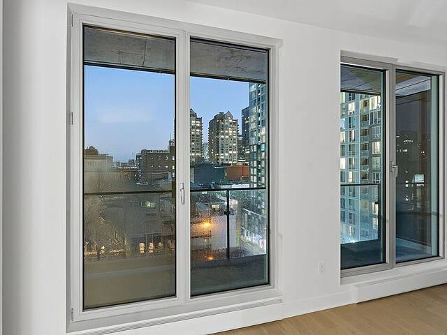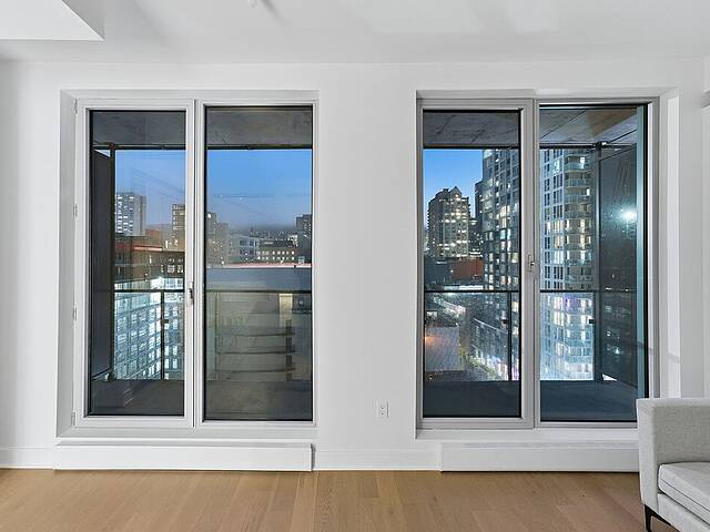 Units: -Porcelain, Dekton, or quartz countertops and backsplash -9-foot ceiling height, primarily in living spaces -Quality acoustic soundproofing -Double-energy glazed windows with sealed units, low-e, and argon -Air exchanger included in each unit -Concealed air conditioning with roof condensers for 1 to 3-bedroom units -Architectural electric baseboard heating connected to digital thermostat -Pre-wiring for telephone, cable, and internet -Included lighting fixtures: recessed in the kitchen, entrance hall and bathrooms; functional lighting for laundry rooms and walk-ins -Gypsum-covered concrete columns -Condo delivered with 2 coats of white paint -Private balconies with glass railings for most units -Secure lock with Medeco key